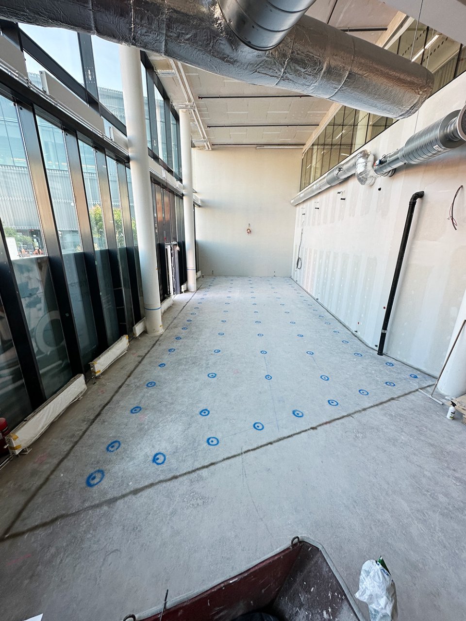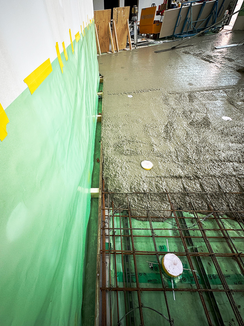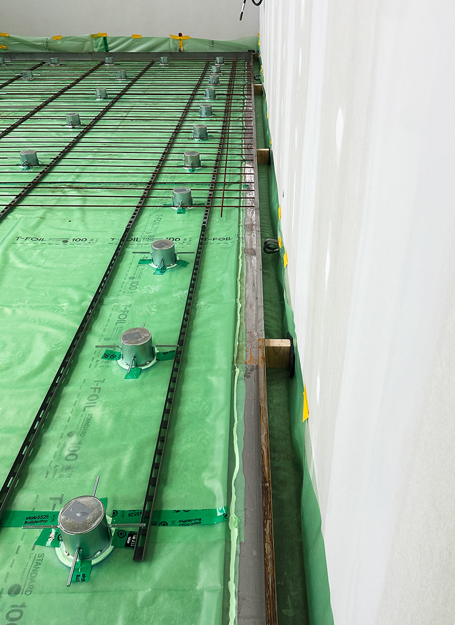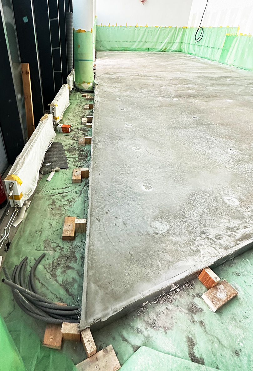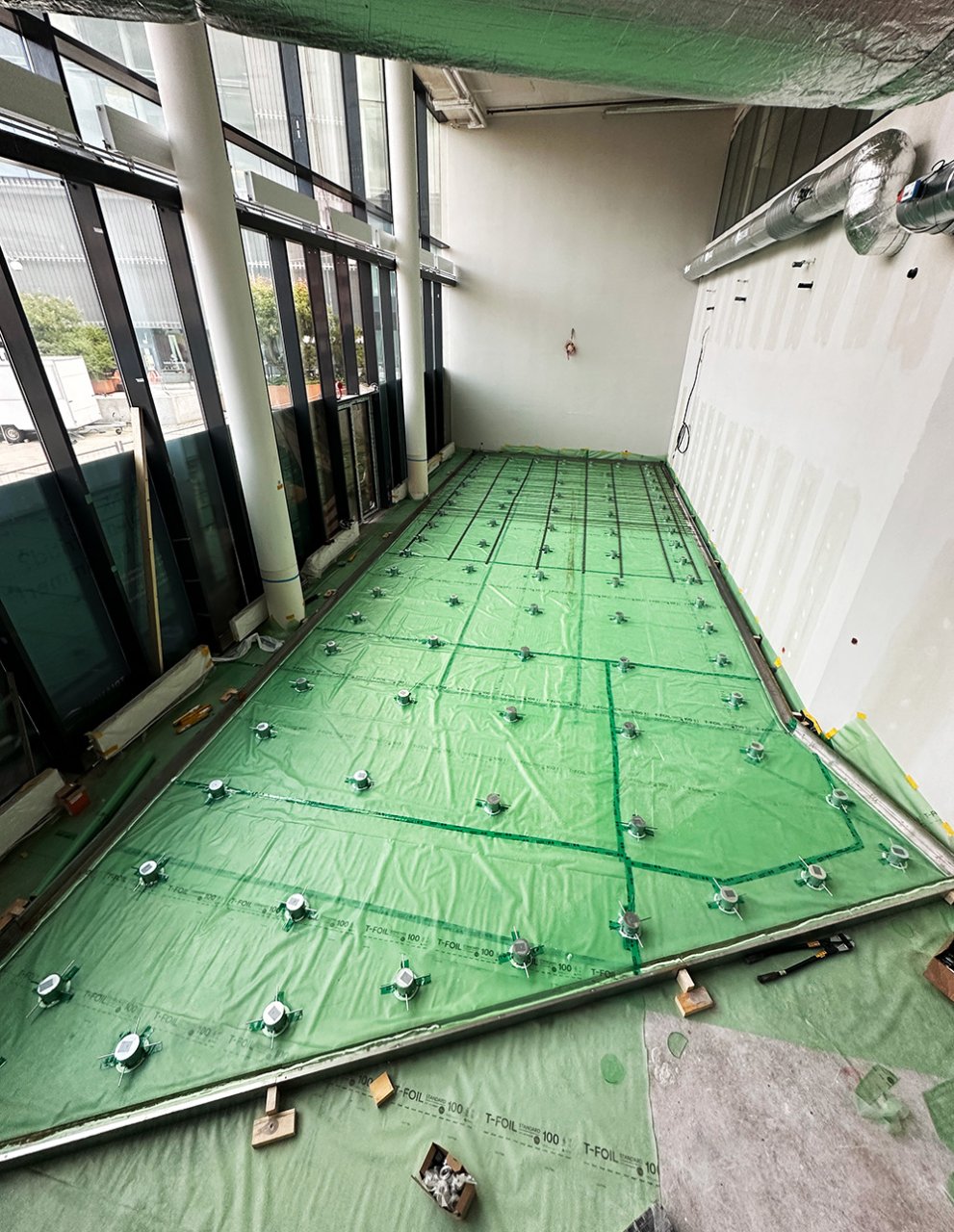 To minimize disturbing noise to adjacent offices, the floor was constructed with a 120mm floating concrete slab using Vibratec’s Jack-Up Spring System VT-JFS.