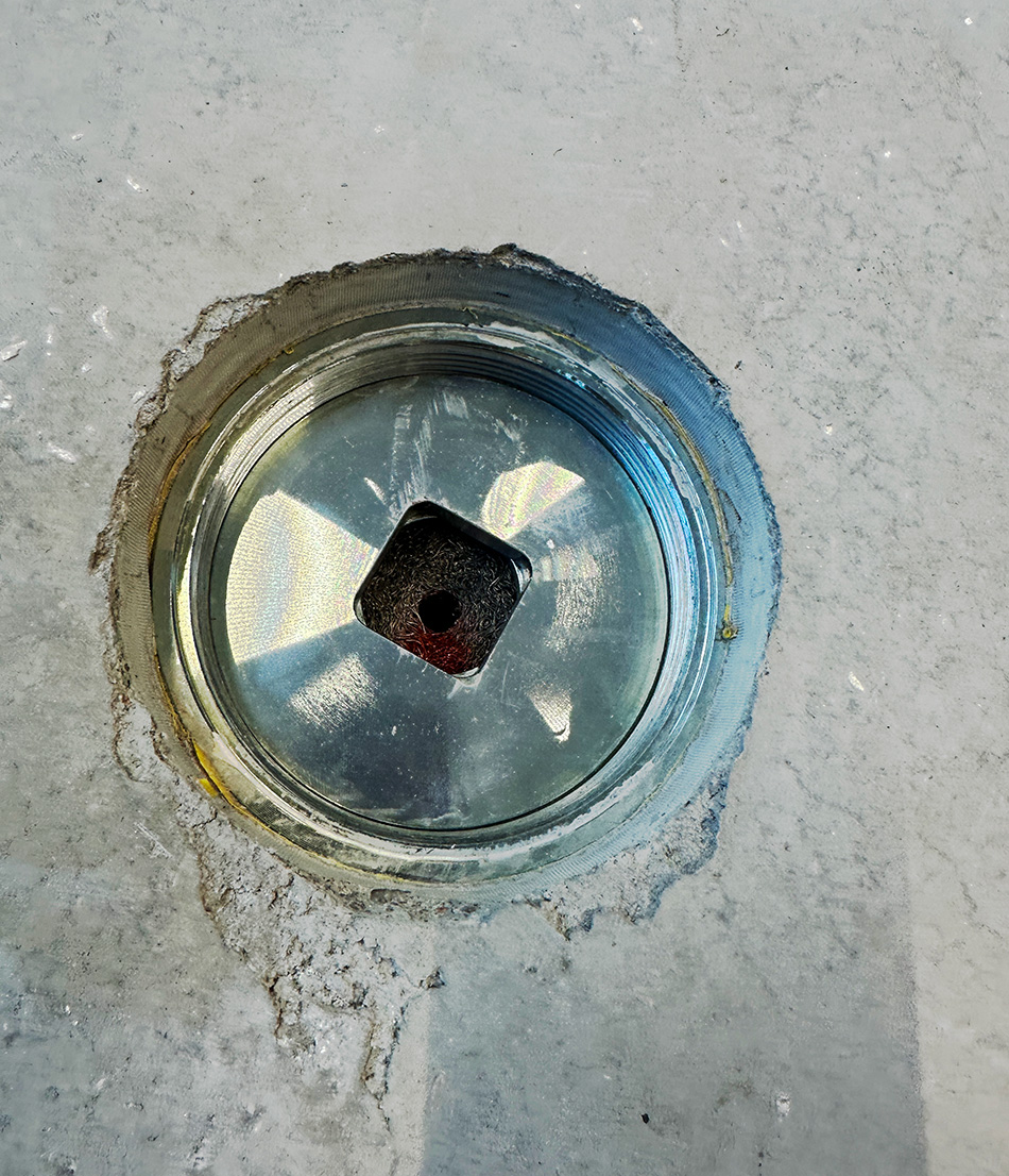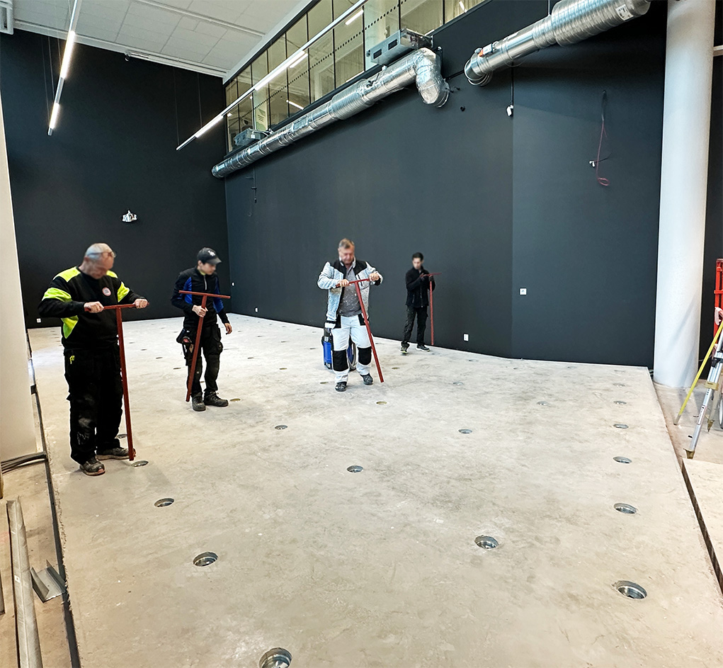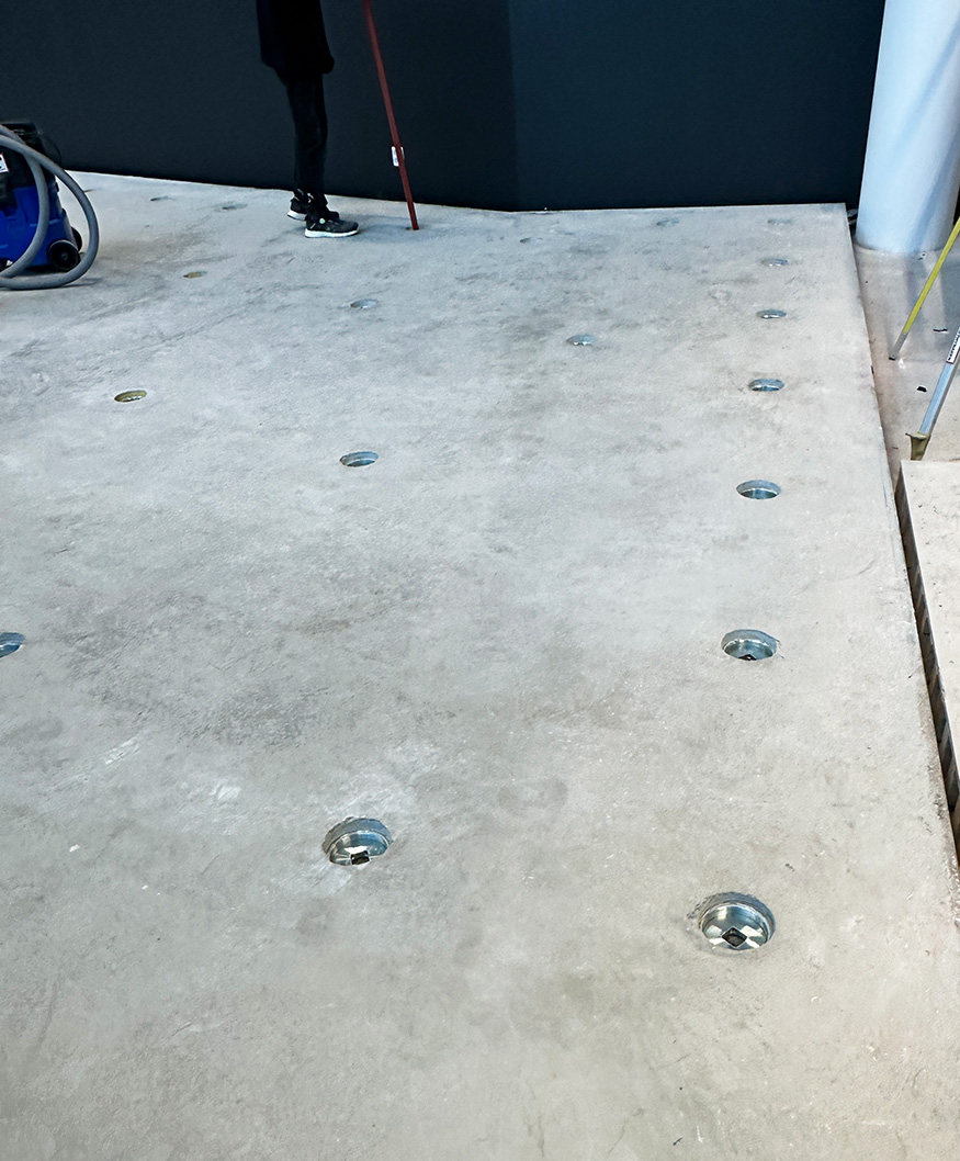 The floor system consists of vibration isolators that are cast into a concrete slab and then raised to provide elastic decoupling and an air gap to the subfloor. This creates a heavy floating floor with excellent vibration isolation, even at low frequencies.