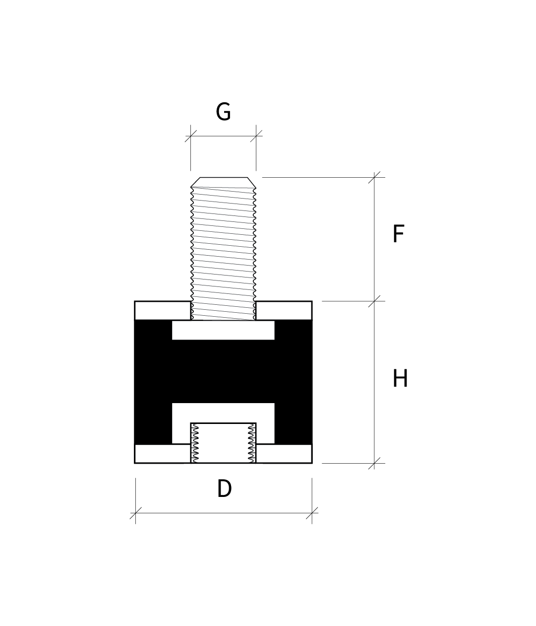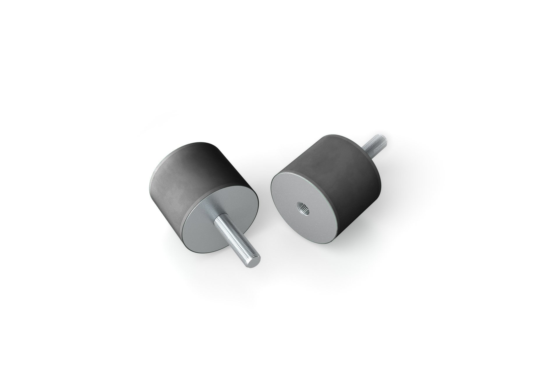 Tärinänvaimennin tyyppi B, lieriömäinen, pultilla ja sisäkierteellä. Valmistetaan 40°, 45°, 55°, 60° ja 70° Shore.