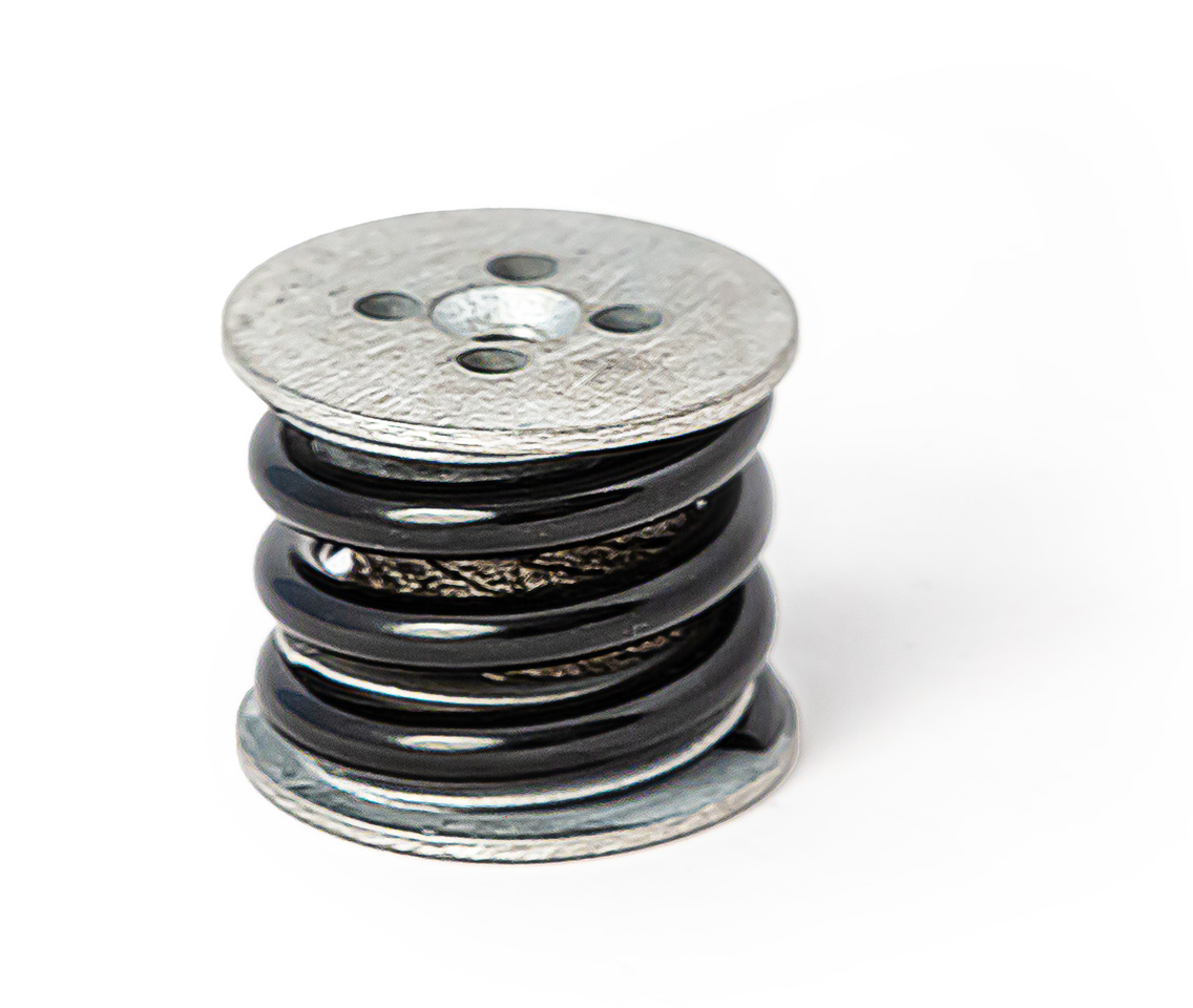Helmetallisolator med stålfjær, dempelement i 18/8 rustfri ståltråd og ruller i aluminium. Utmerket for vibrasjonsisolering på grunn av den svært lave egenfrekvensen på 8 - 11 Hz.