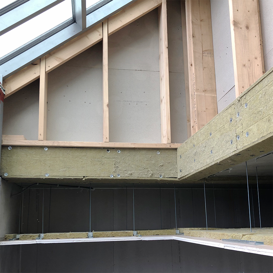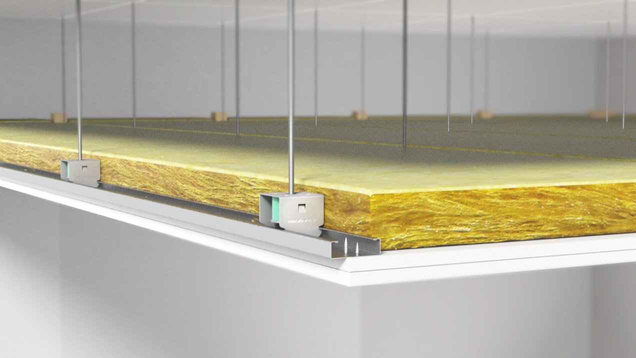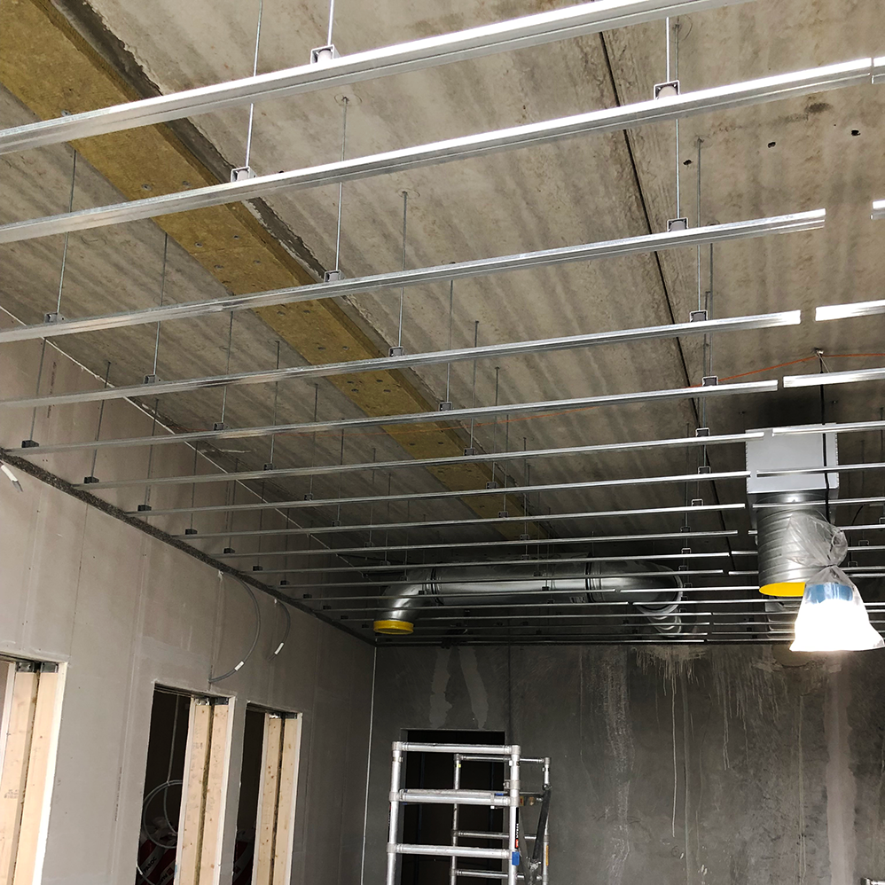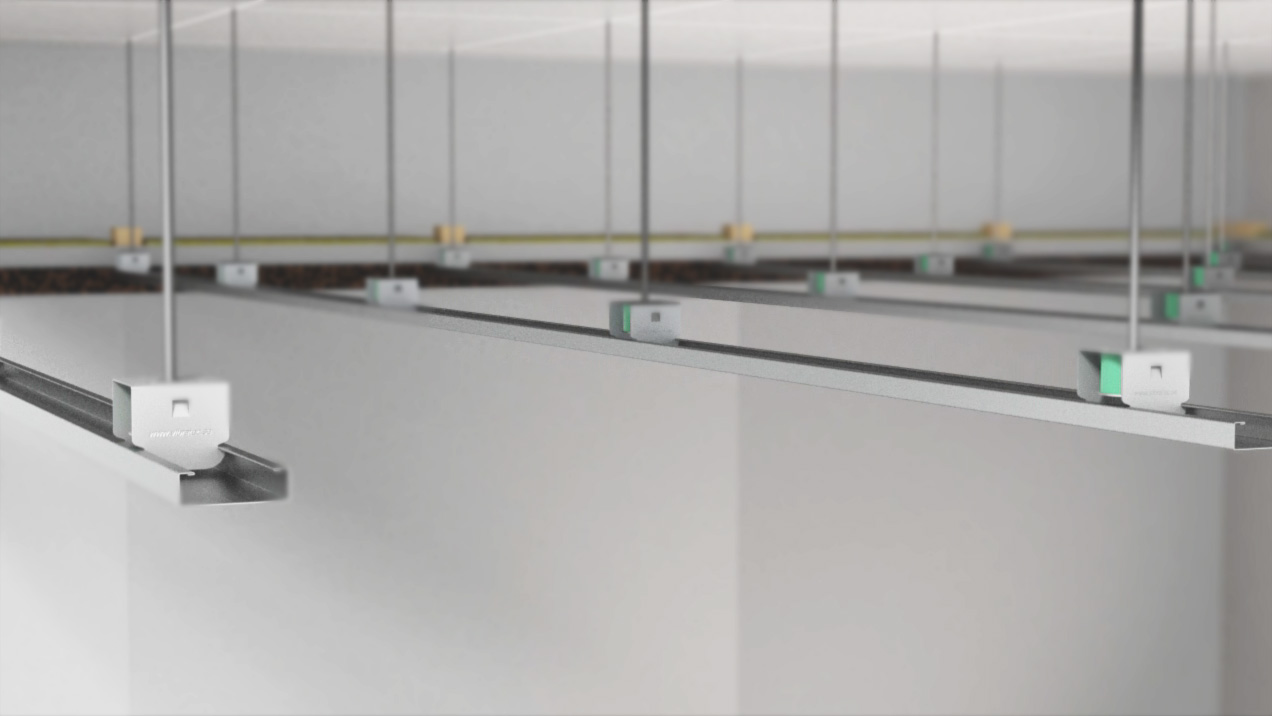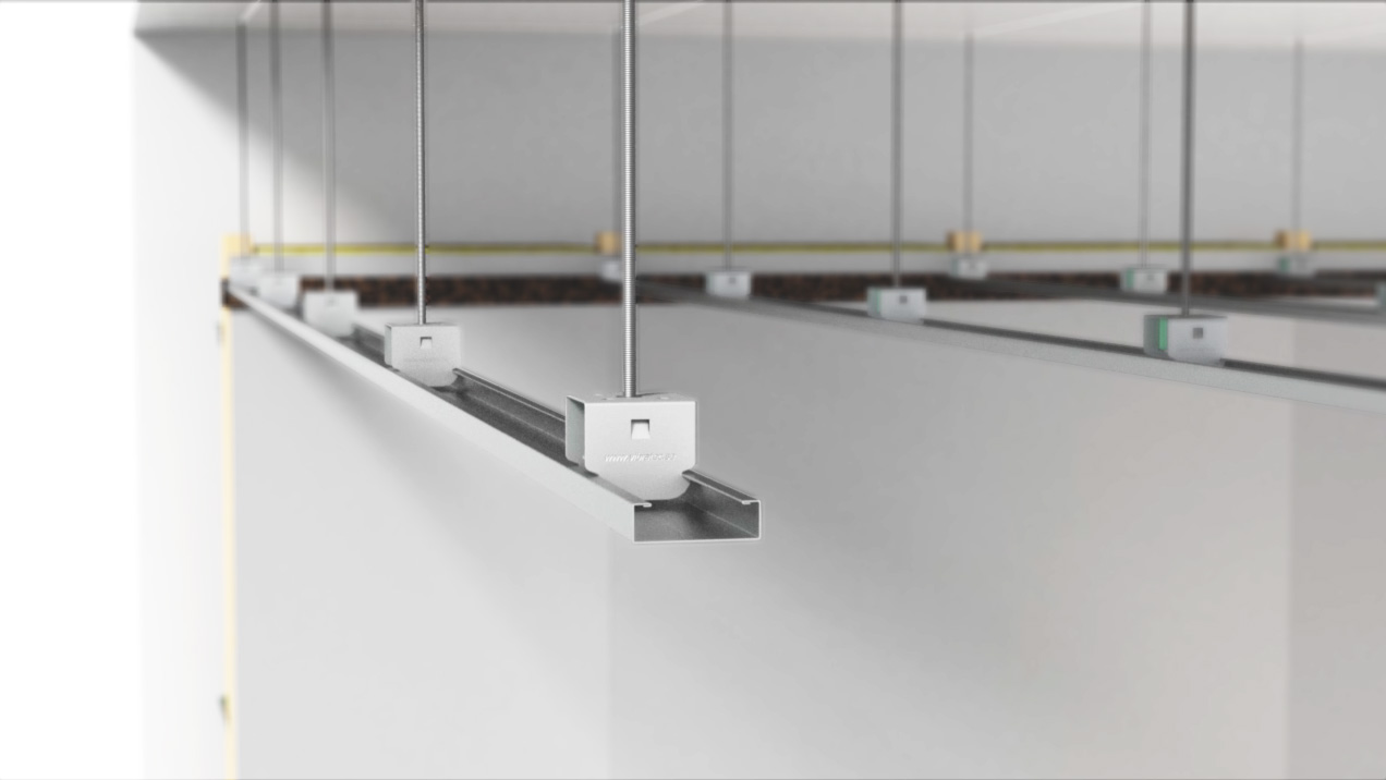 The hangers are mechanically fixed to the ceiling and the profile rail is clicked on to the hangers. Plasterboard can then be fixed on to the rails. VT-SFC hangers must only be used with Vibratecs profile rails to ensure structural stability of the ceiling. A self adhesive elastic strip VT-strip should be used to isolate the suspended ceiling from surrounding walls to avoid undermining the acoustic integrity of the ceiling.
