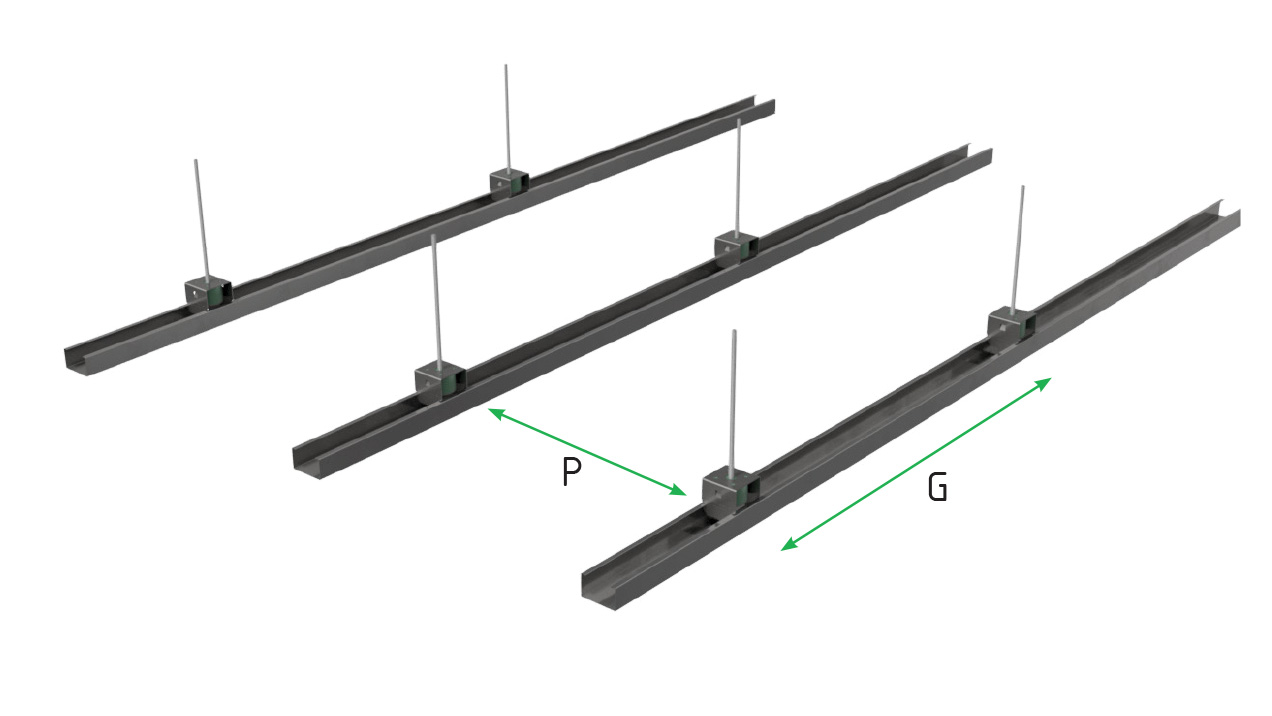 | ceiling weight kg/m2 | P (mm) | G (mm) | kg/hanger | fn (Hz) |