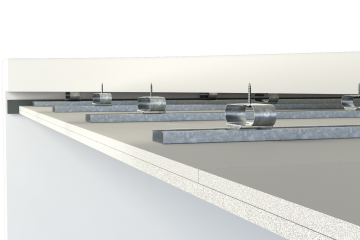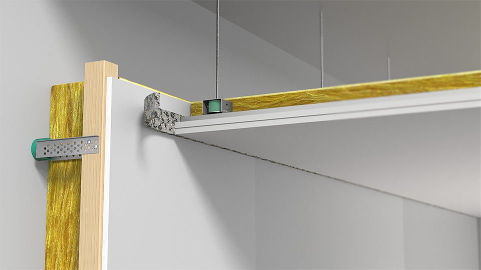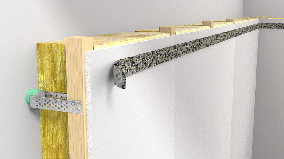 VT-Strip can be attached on the surrounding walls before installing a vibration isolated floating floor or inner ceiling.