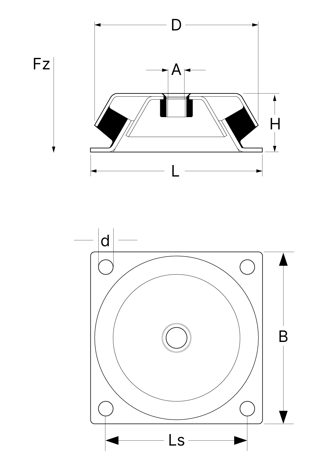 | Type | Plate | L | B | H | Ls | D | d | A |