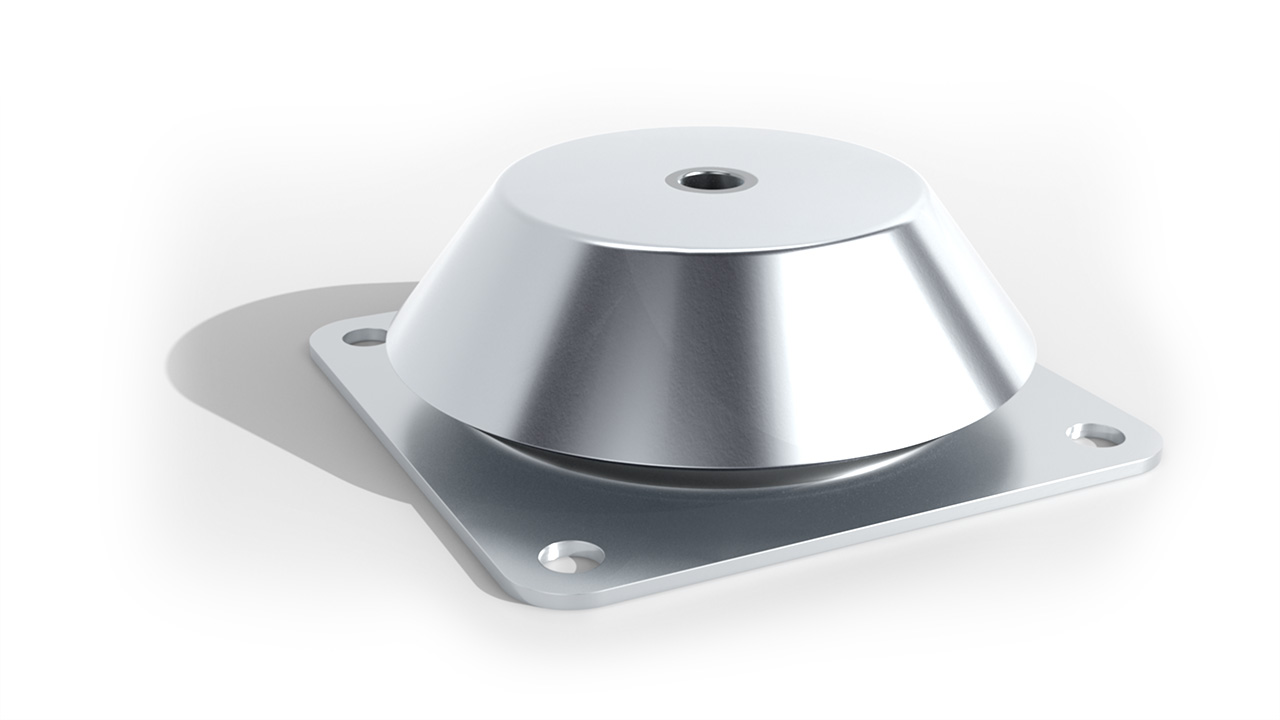 This elastomer mount is a rubber isolator for engine and machine suspension in land based and marine applications. Available in hardness 40, 55 or 70 shore. A vibration isolator with a natural frequency between 10-15 Hz for the recommended load range.