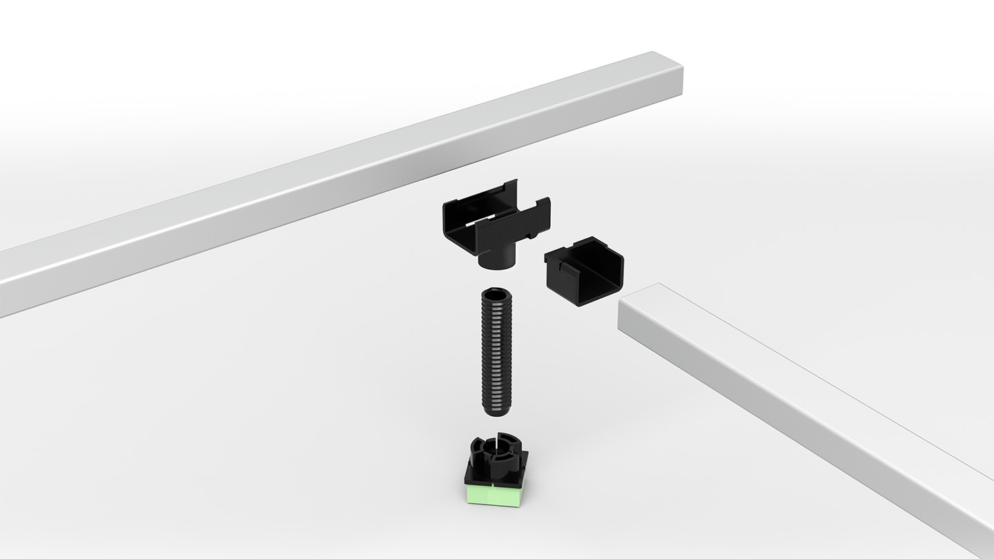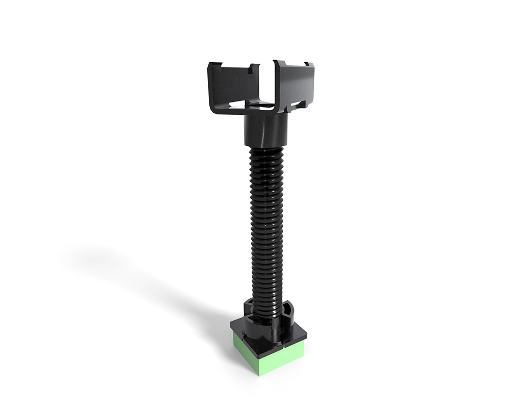 The system consists of very robust ABS plastic components, damping pad and aluminum profiles (Al-bars) – all components are clicked together. By using different types of damping pads, different noise reduction can be achieved, and by playing with c/c distances, higher load capacity (or less bounce) can be obtained.