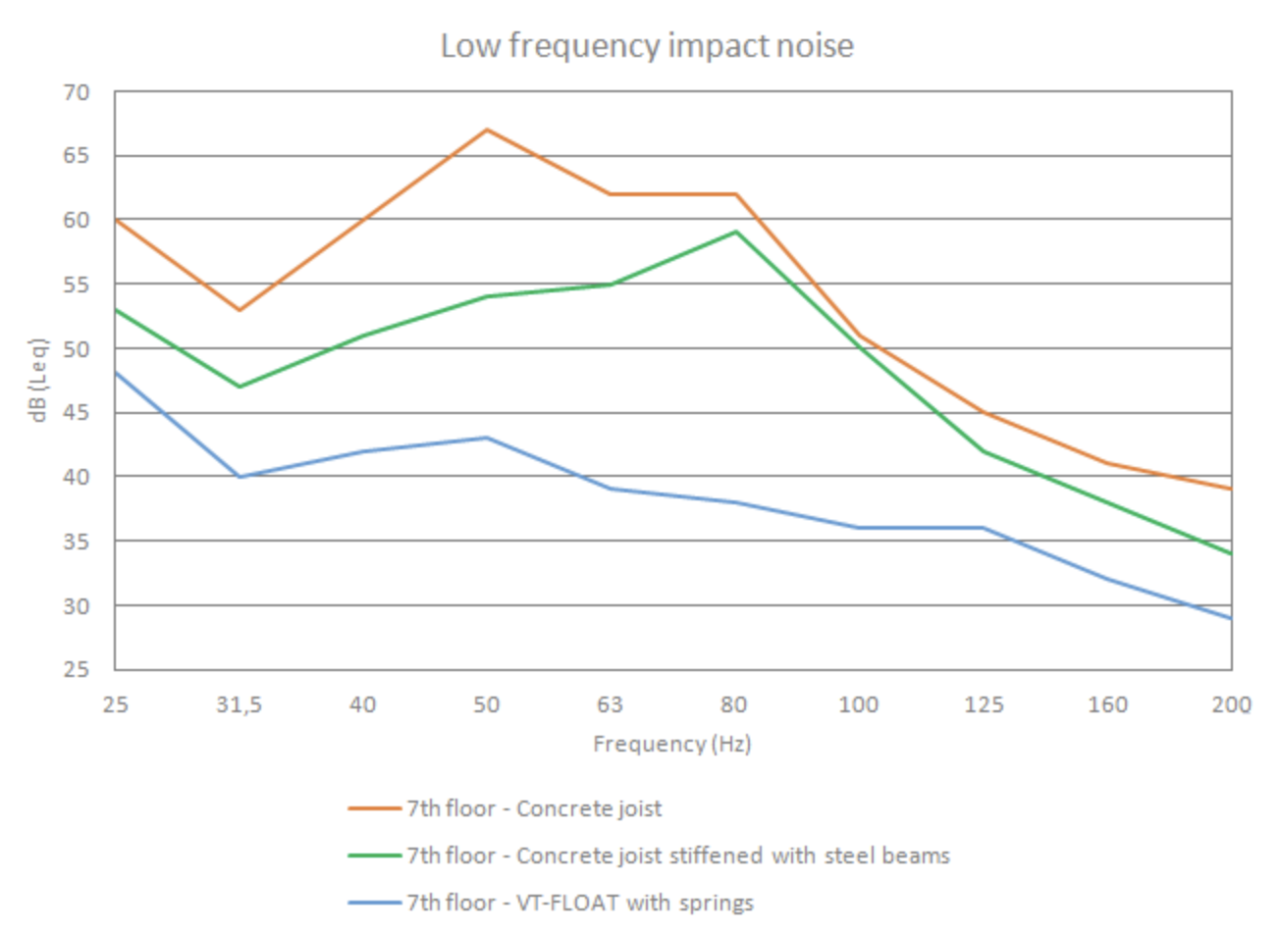 Heavy floating concrete floors are often required in applications such as bowling lanes, cinema halls, gym floors, discotechs, machine foundations etc. Vibratec can also offer the on-site installation of the system plus verification measurements of Ln and Rw.