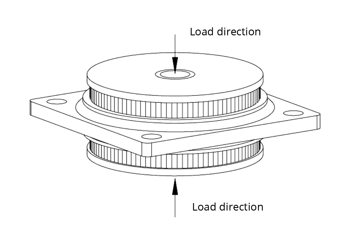 Radial loads are accepted up to 100 daN. Over that limit the centre pin short-circuit the isolator and acts as a mechanical stop.