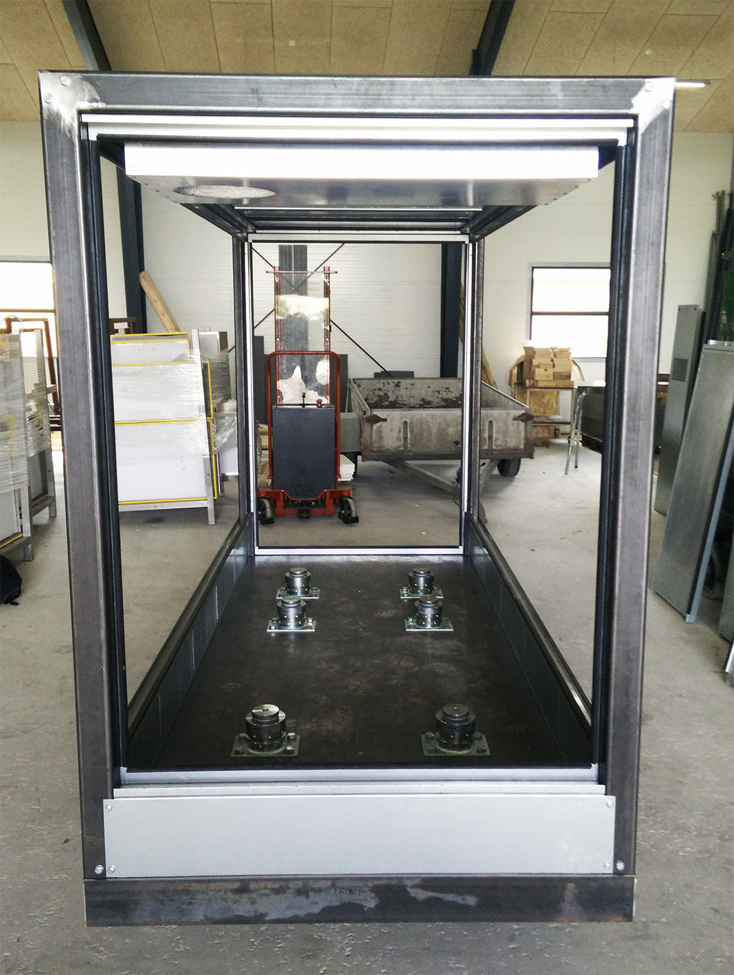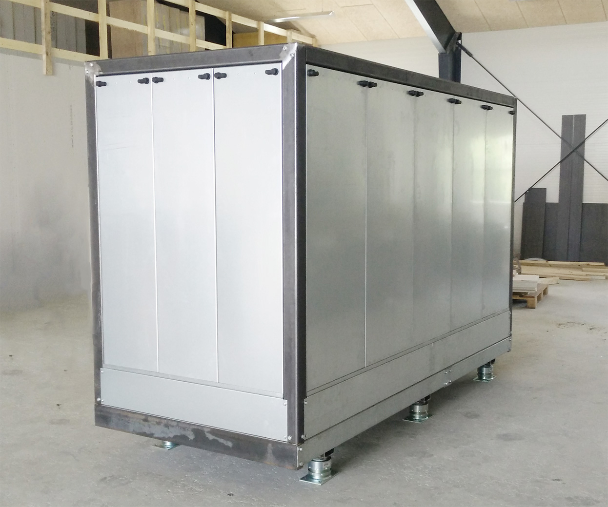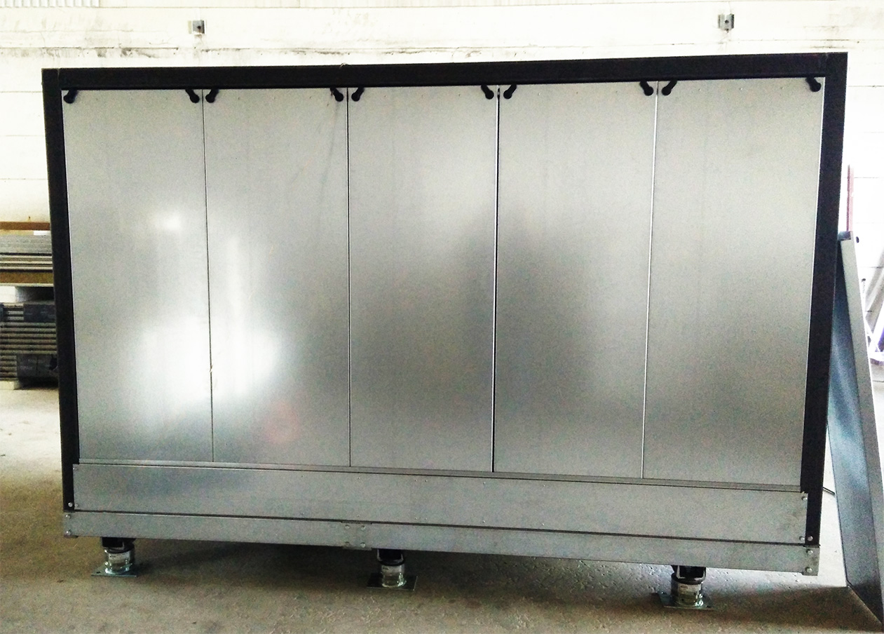 A standard modular noise enclosure in aluminum, galvanized or AISI 316 steel. Easy to assemble with bolts, joints and corner profiles. Panel thickness is standard of 25 mm, but can be manufactured in 50 mm thickness or even higher.