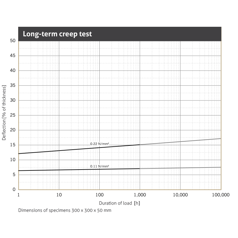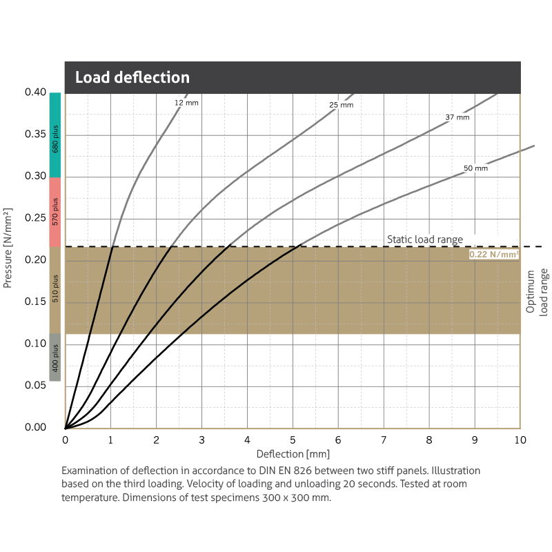 | Static modulus of elasticity | Based on EN 826 | 1.1 - 1.7 N/mm2 | Tangential modulus, see figure “modulus of elasticity” |