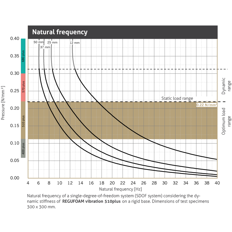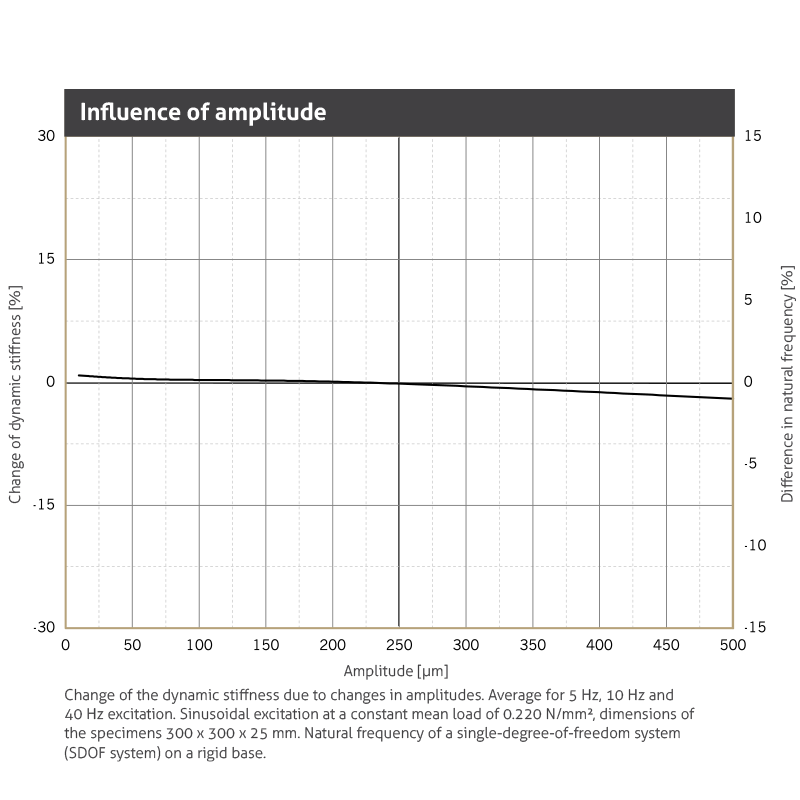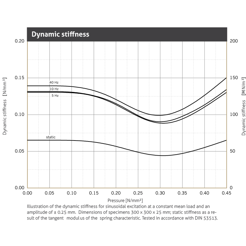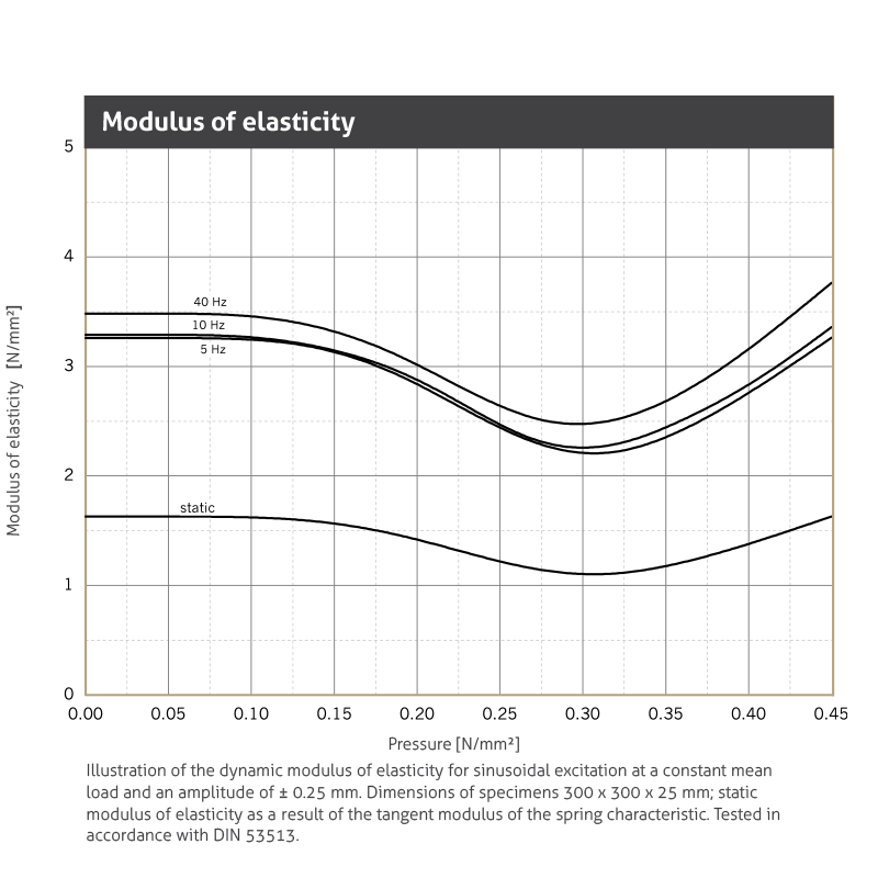 | Dynamic modulus of elasticity | Based on DIN 53513 | 2.2 - 3.7 N/mm2 | Depending on frequency, load and thickness, see fi gure “dynamic stiffness“ |