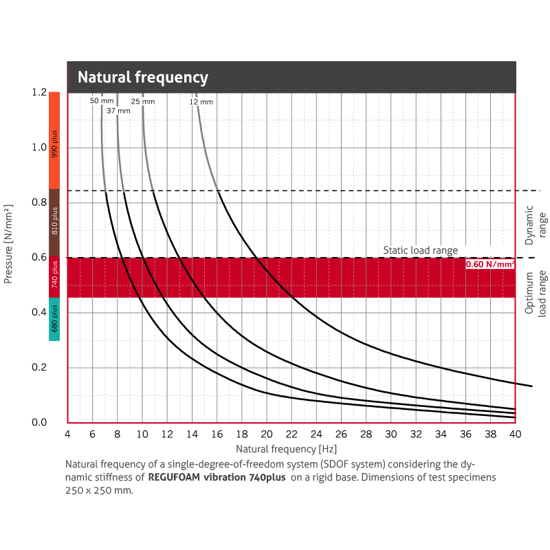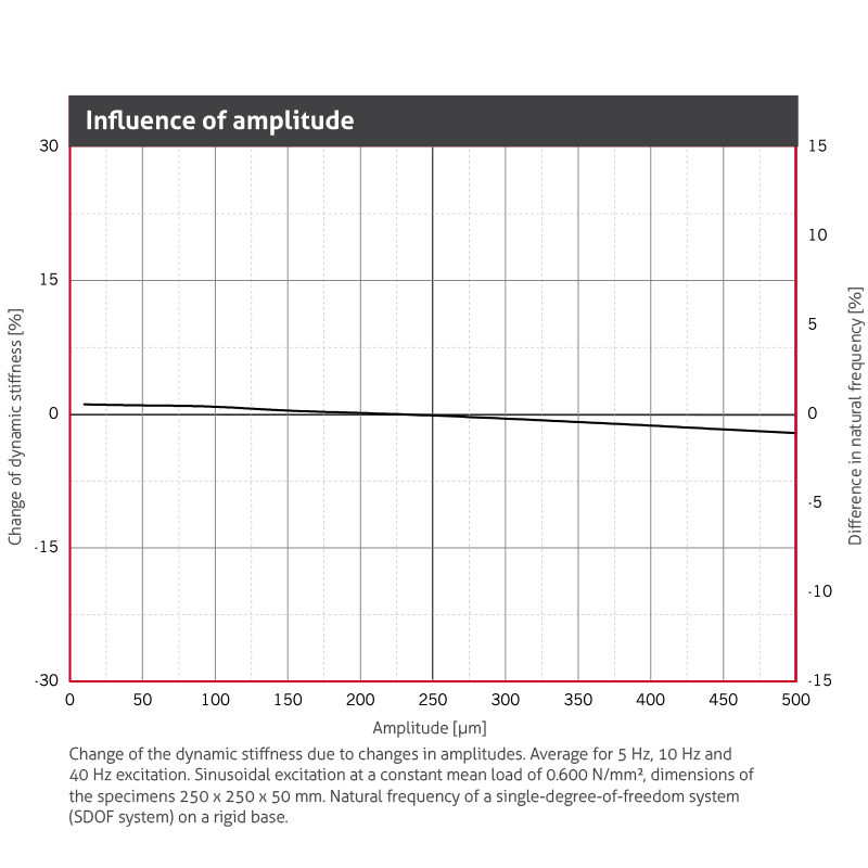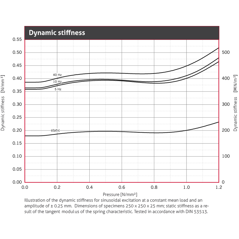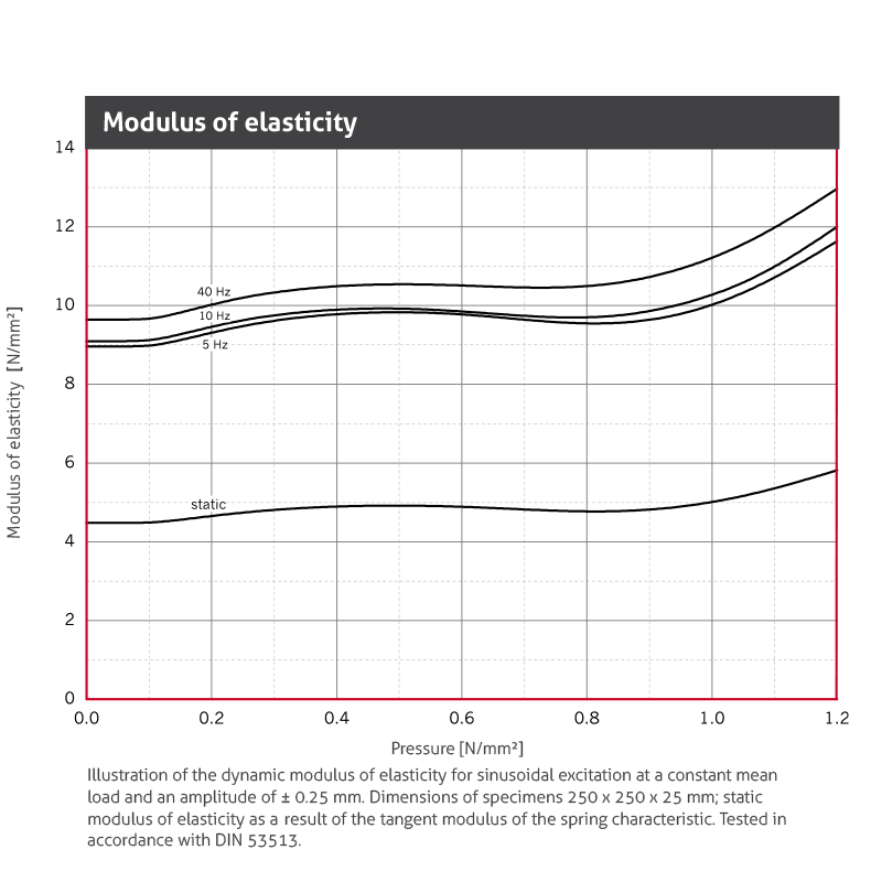 | Dynamic modulus of elasticity | Based on DIN 53513 | 8.9 - 13.0 N/mm2 | Depending on frequency, load and thickness, see fi gure “dynamic stiffness“ |