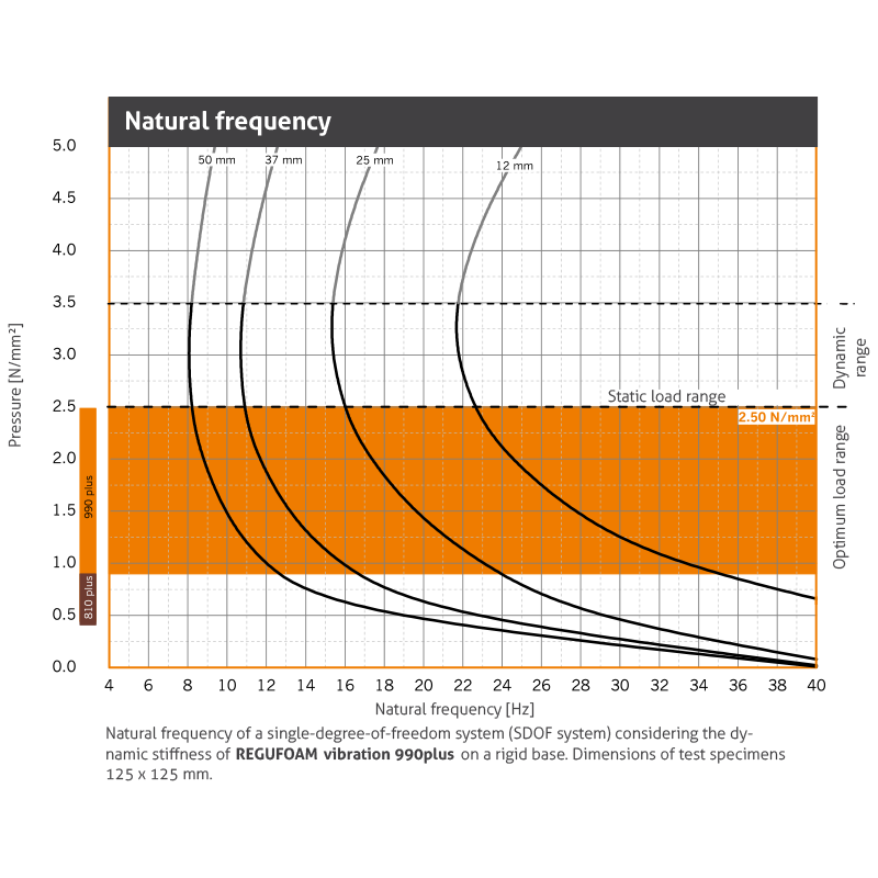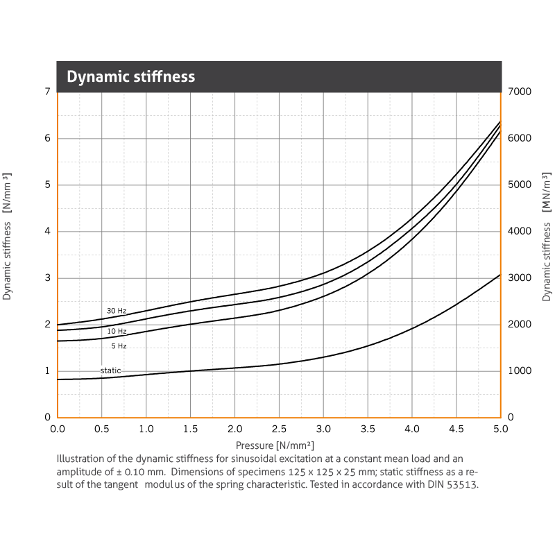 | Dynamic modulus of elasticity | Based on DIN 53513 | 41.0 160.0 N/mm2 | Depending on frequency, load and thickness, see fi gure “dynamic stiffness“ |