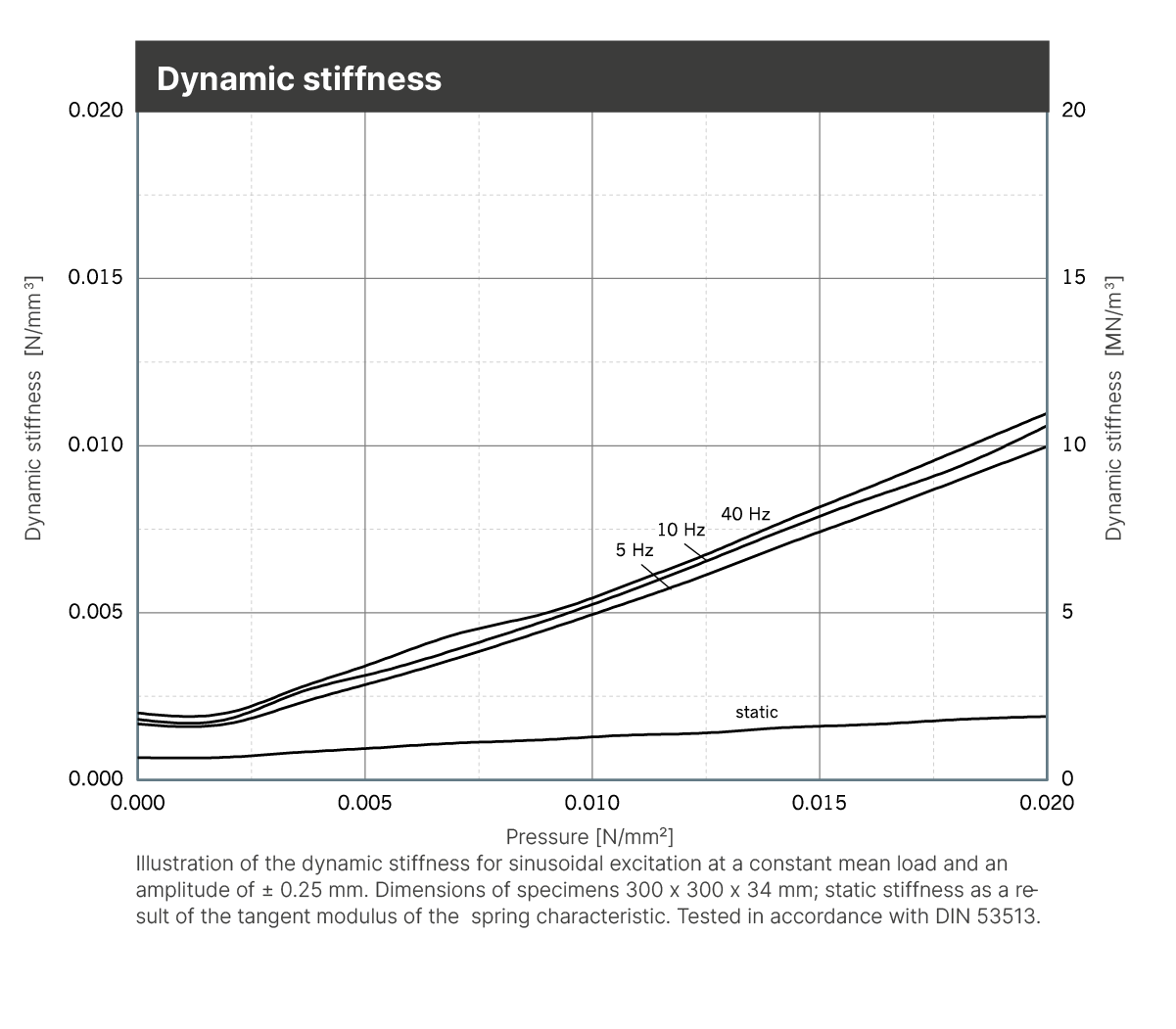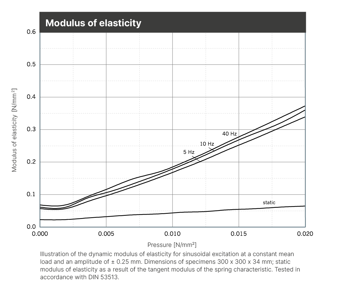 | Dynamic modulus of elasticity | Based on DIN 53513 | 0.05 - 0.38 N/mm2 | Depending on frequency, load and thickness, see figure “dynamic stiffness“ |