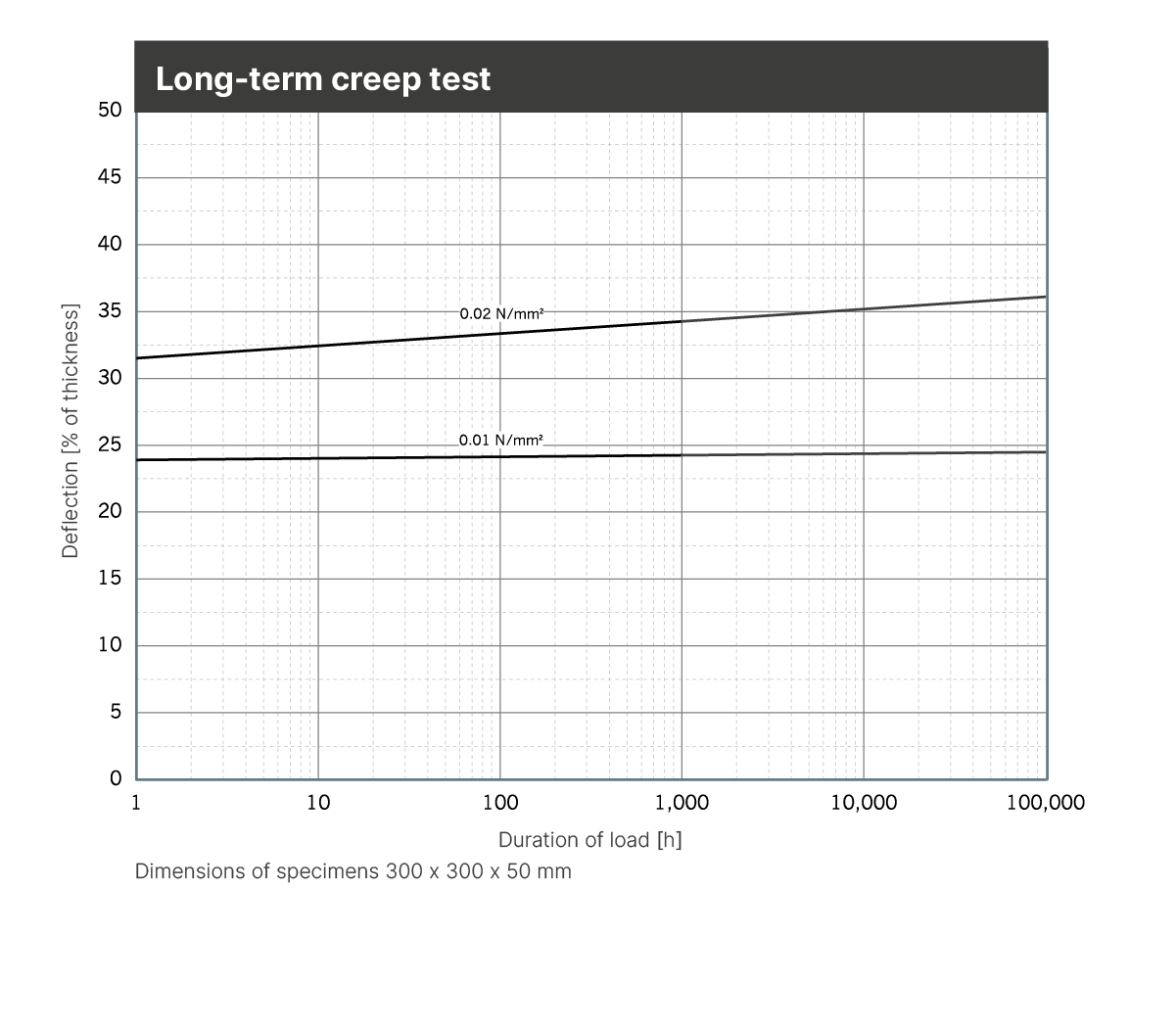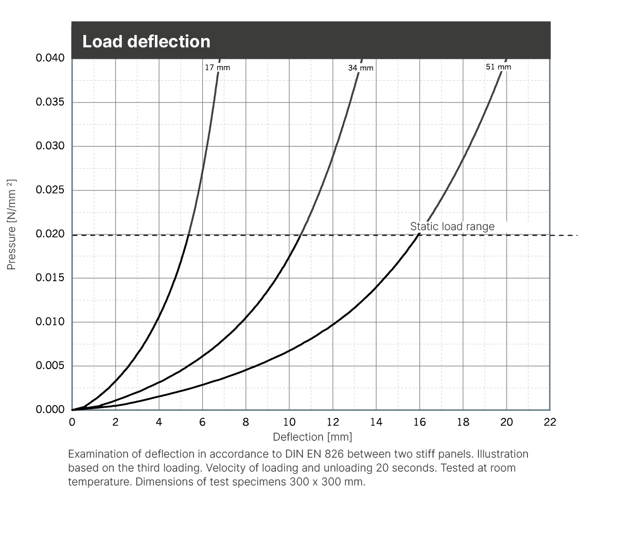 | Static modulus of elasticity | Based on EN 826 | 0.02 - 0.08 N/mm2 | Tangential modulus, see figure “modulus of elasticity” |