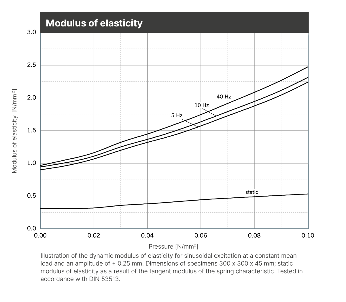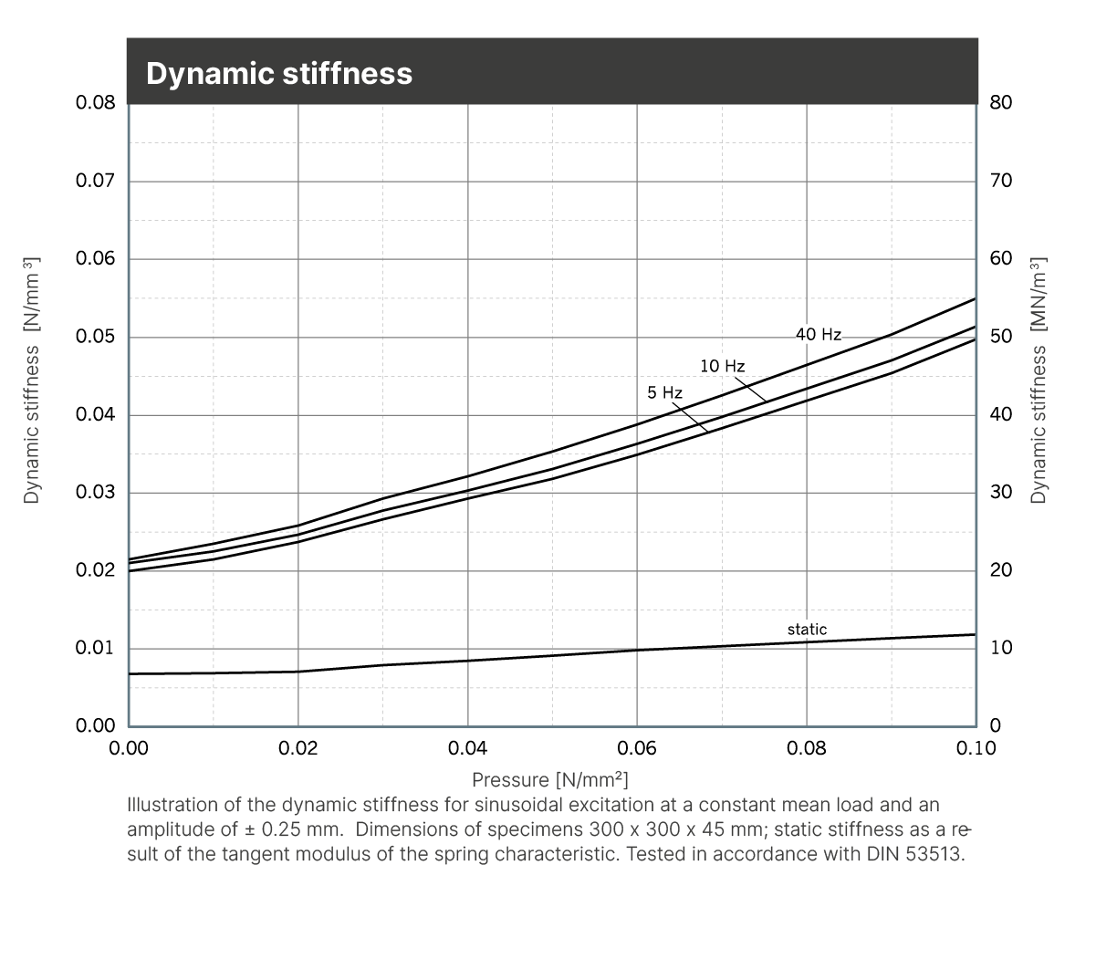 | Dynamic modulus of elasticity | Based on DIN 53513 | 0.9 - 2.4 N/mm2 | Depending on frequency, load and thickness, see figure “dynamic stiffness“ |