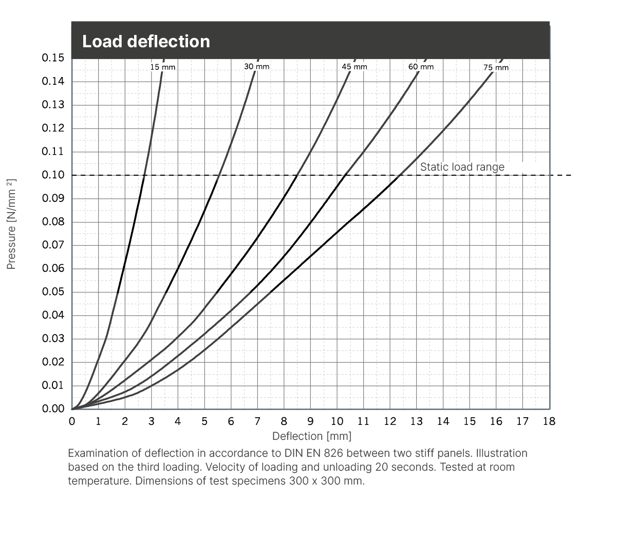| Static modulus of elasticity | Based on EN 826 | 0.30 - 0.55 N/mm2 | Tangential modulus, see figure “modulus of elasticity” |