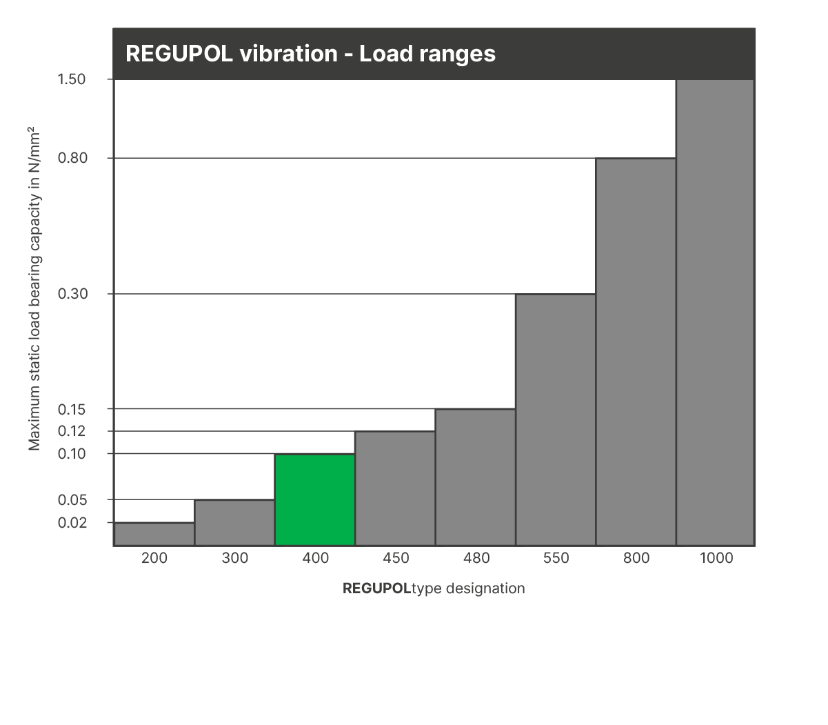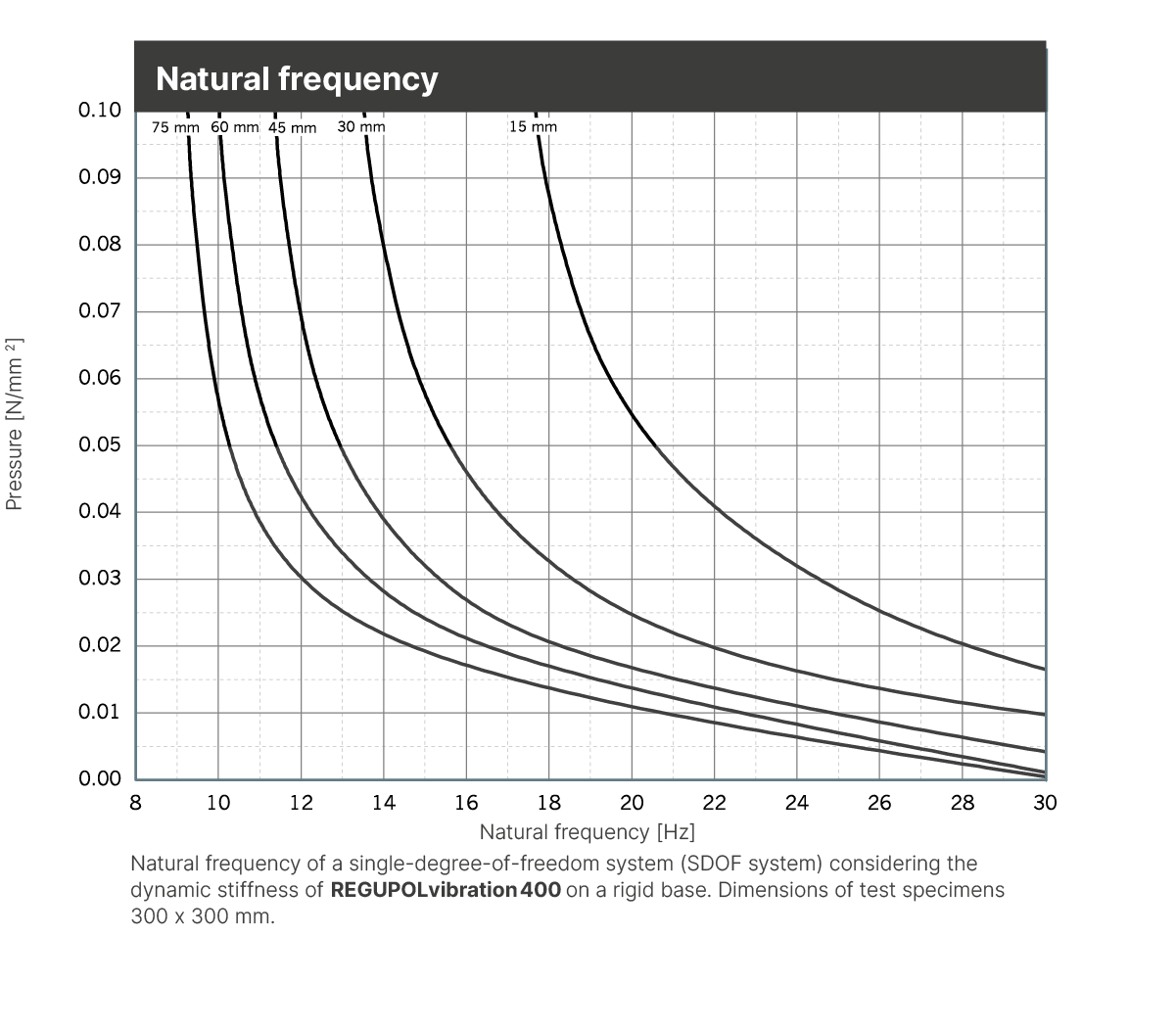 Regupol® vibration is a rubber-polyurethane-composite for vibration isolation. It can be used in single or multiple layers to achieve natural frequencies of down to 10 Hz, depending on load and material thickness.