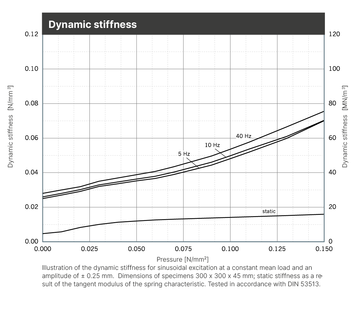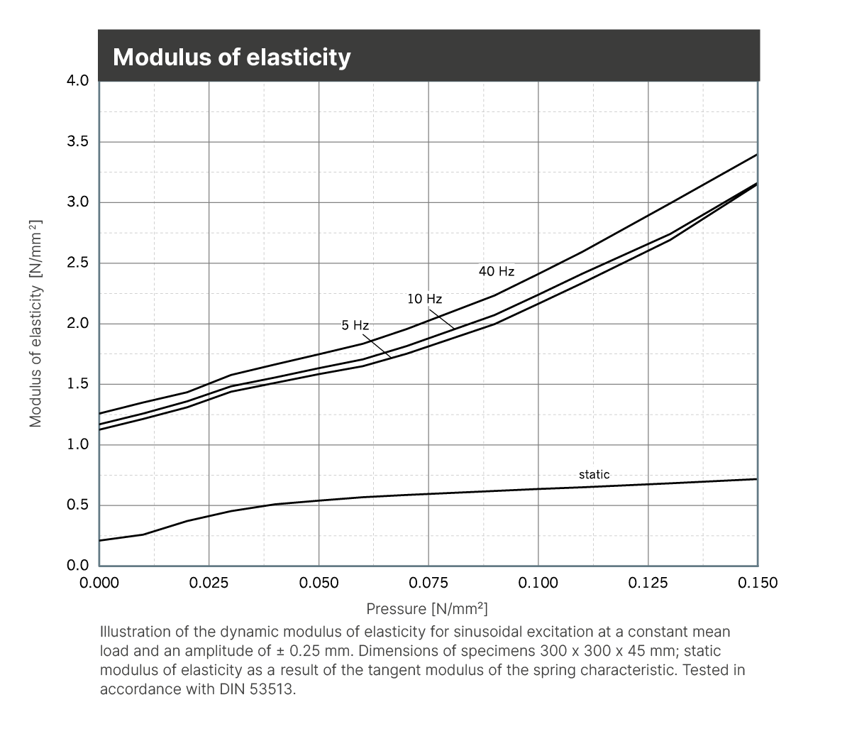 | Dynamic modulus of elasticity | Based on DIN 53513 | 1.2 - 3.3 N/mm2 | Depending on frequency, load and thickness, see figure “dynamic stiffness“ |