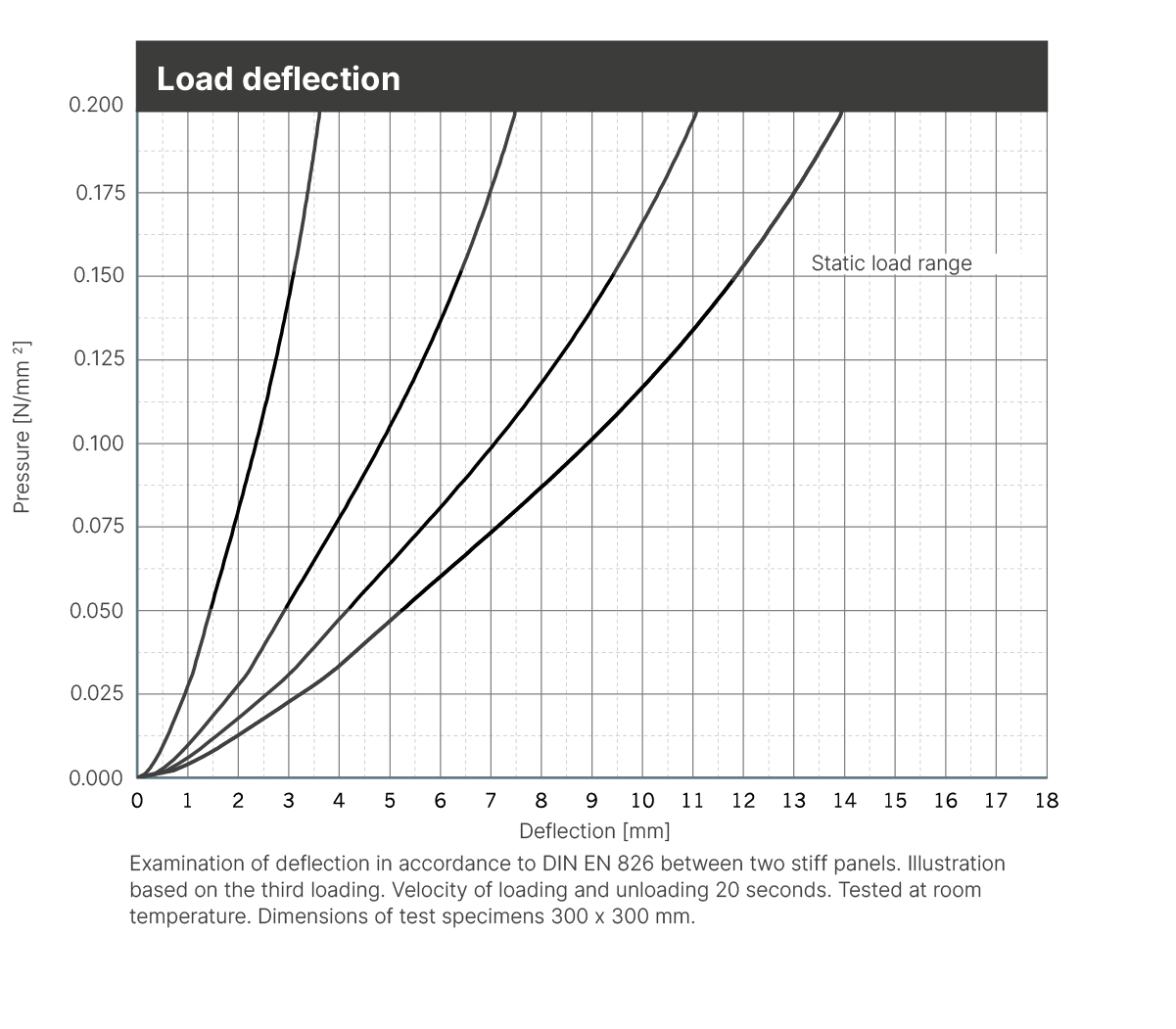 | Static modulus of elasticity | Based on EN 826 | 0.25 - 0.8 N/mm2 | Tangential modulus, see figure “modulus of elasticity” |