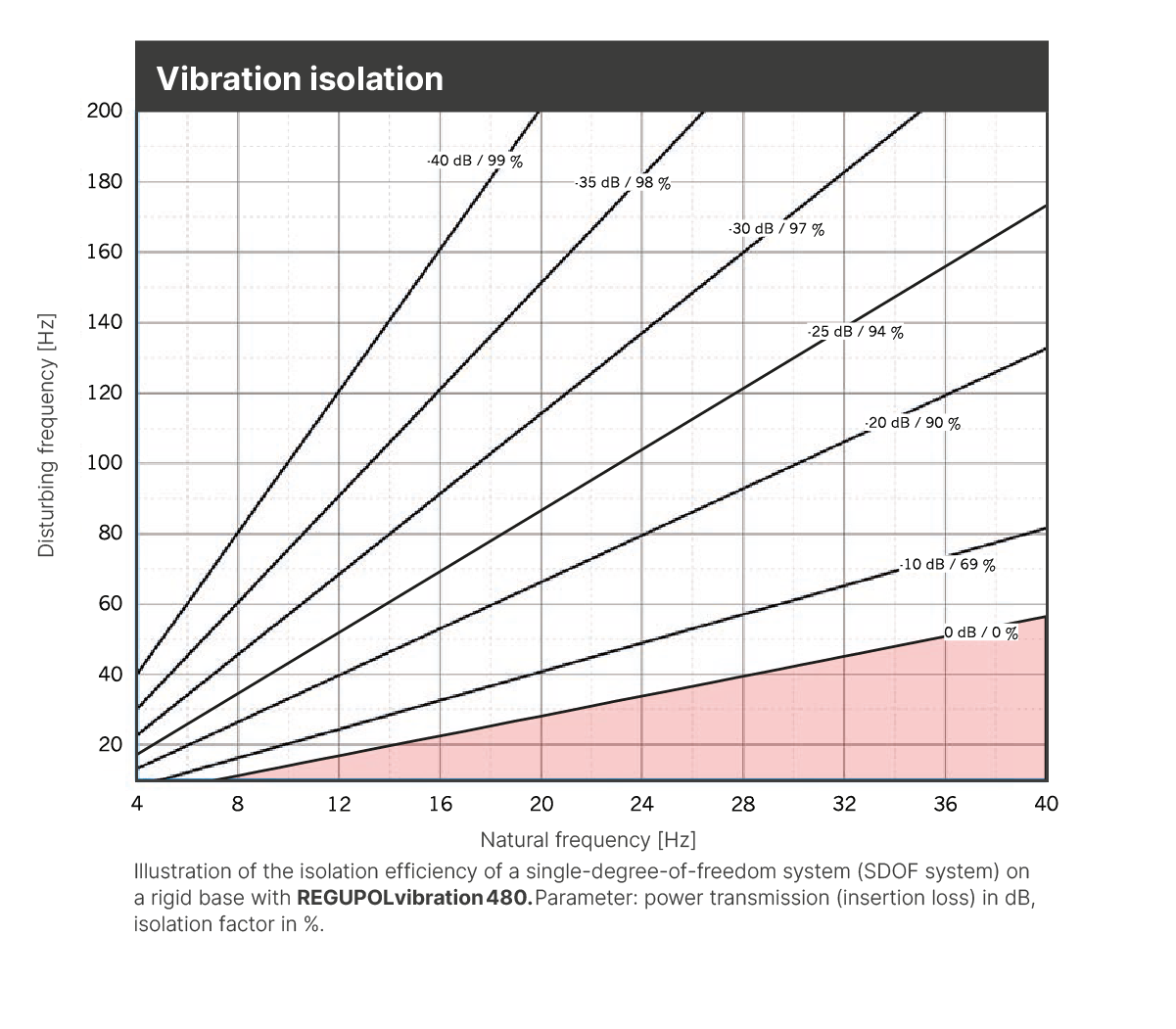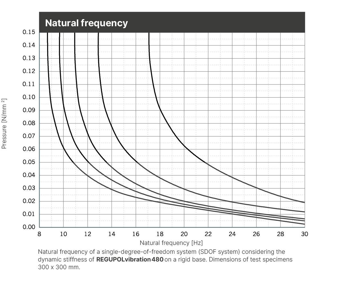 Regupol® vibration is a rubber-polyurethane-composite for vibration isolation. It can be used in single or multiple layers to achieve natural frequencies of down to 10 Hz, depending on load and material thickness.