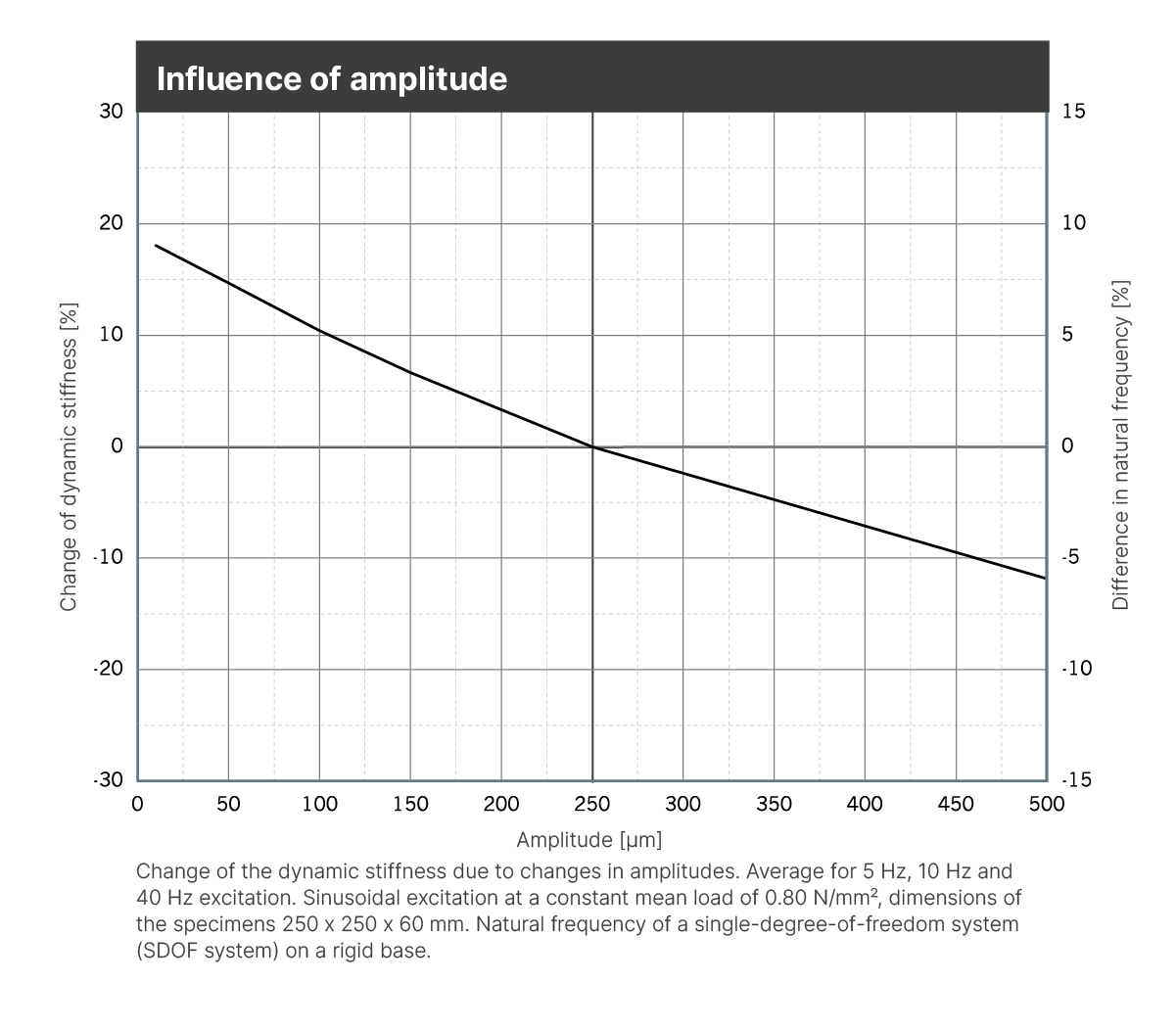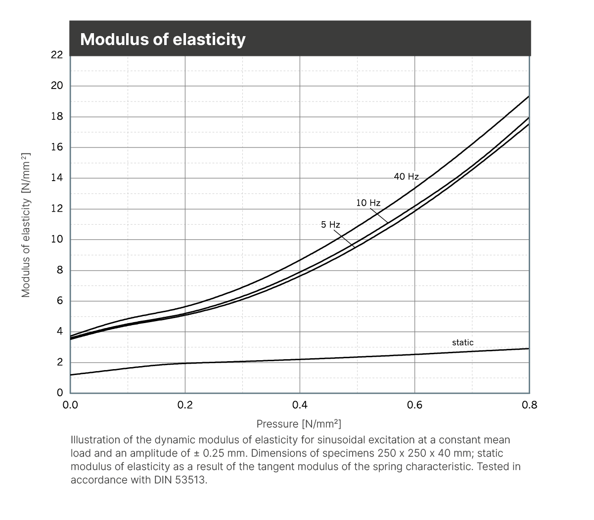 | Dynamic modulus of elasticity | Based on DIN 53513 | 3.6 - 18.2 N/mm2 | Depending on frequency, load and thickness, see figure “dynamic stiffness“ |