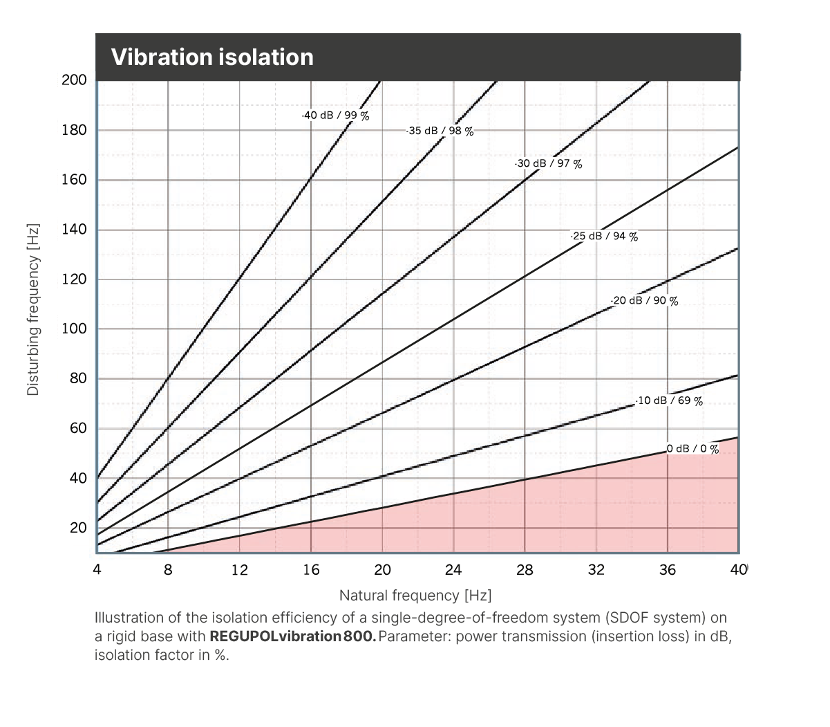 Regupol® vibration is a rubber-polyurethane-composite for vibration isolation. It can be used in single or multiple layers to achieve natural frequencies of down to 10 Hz, depending on load and material thickness.
