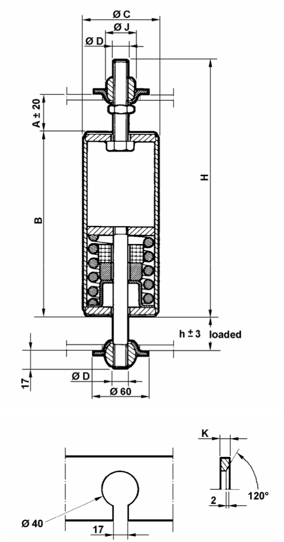 All metal isolator of the single-action type, designed for loading in tension only. Resilient elements: High tensile steel springs and 18/8 stainless steel cushions. Brass spherical nuts. Housing and other parts in steel.