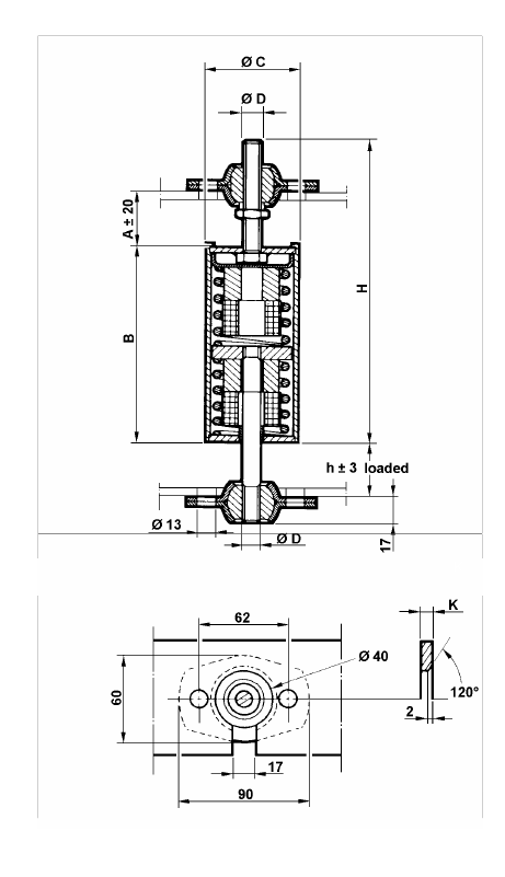 Attachment points to be made as shown in the cross-selection A-A. The mount may then be easily hooked onto the bracket without removing the nuts. The distance between the cups can be adjusted by turning the sleeve and locking the nut. The isolator must not be tensioned. Dimension “h” must be checked after thermal expansion of the pipe and the locknut locked afterwards. Dimension “h” must be within the ± 3 mm tolerances.