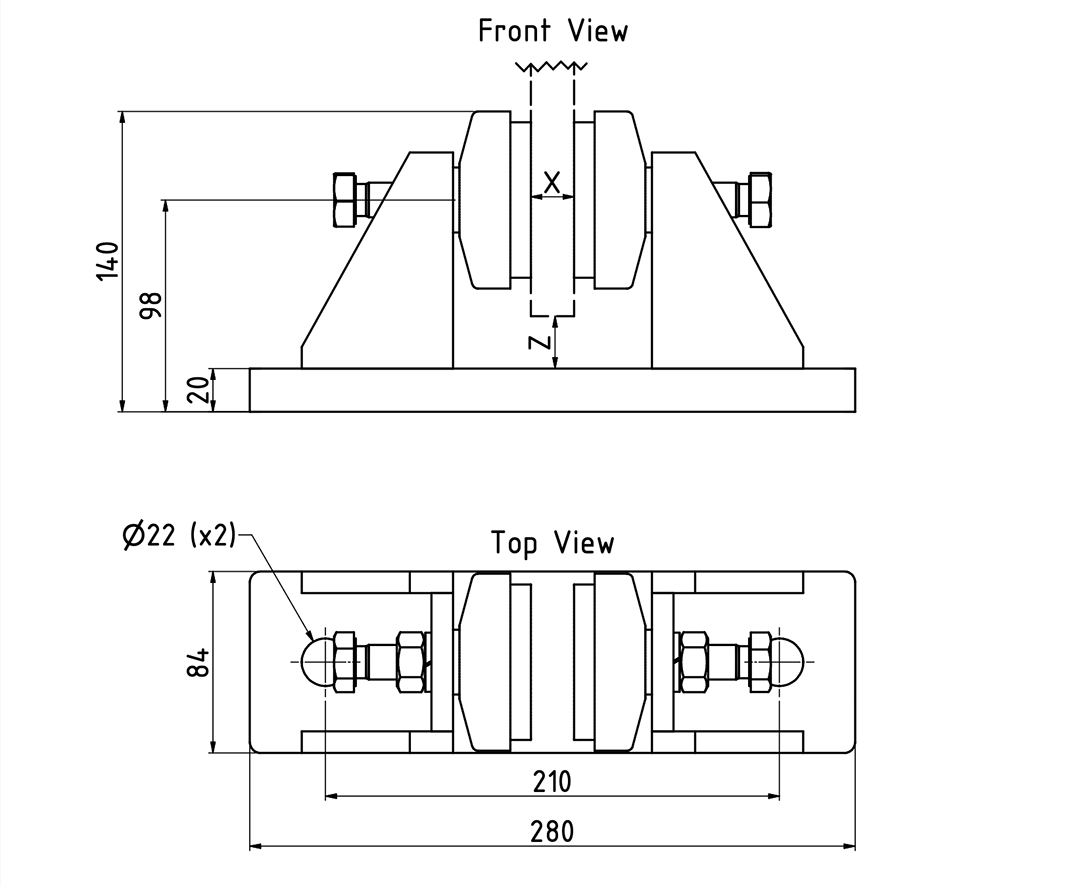 The isolator is supplied with extra washers to accommodate fin thickness variants 12.5, 14, 18 and 20 mm fin thicknesses. As the elastic elements are very progressive the 14 mm gap can be used for 16 mm fin thickness as well.