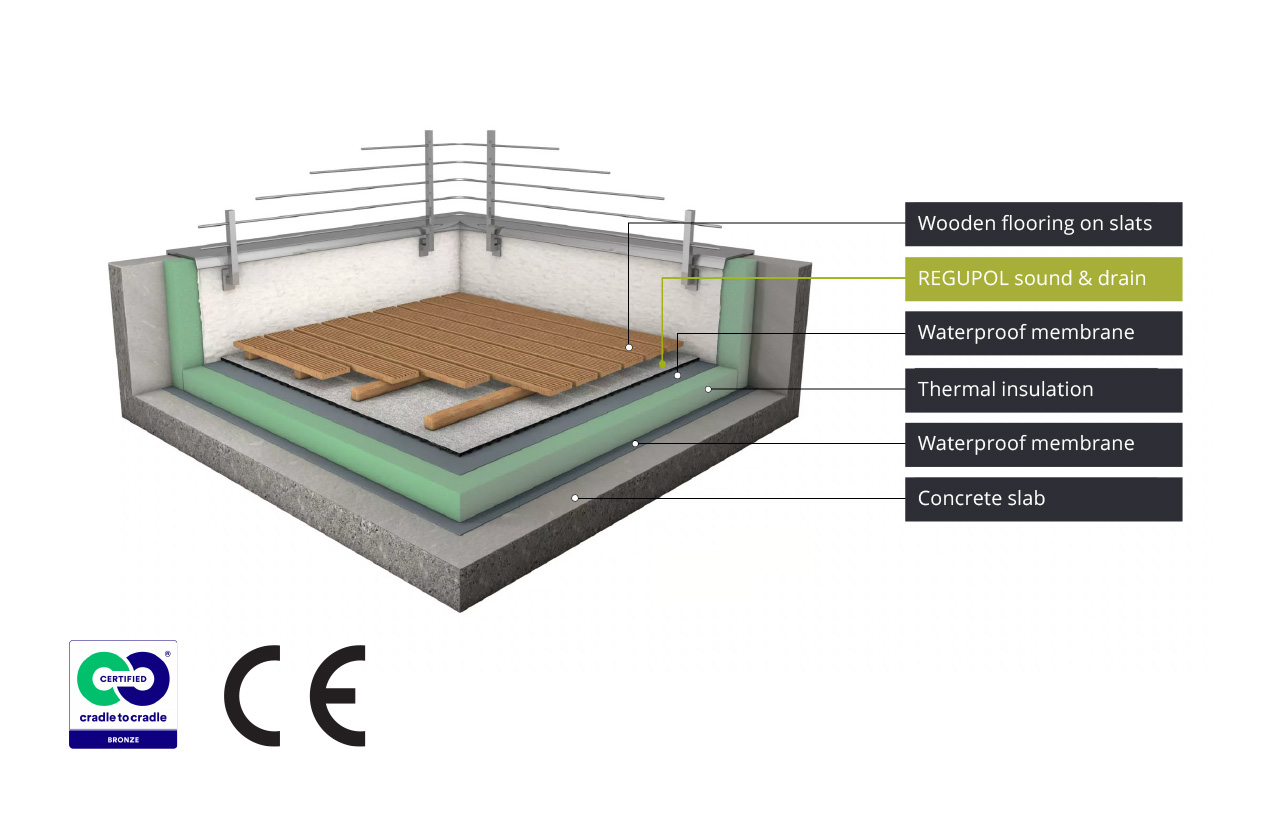Acoustic insulation, membrane protection and drainage for outdoor applications in one product!